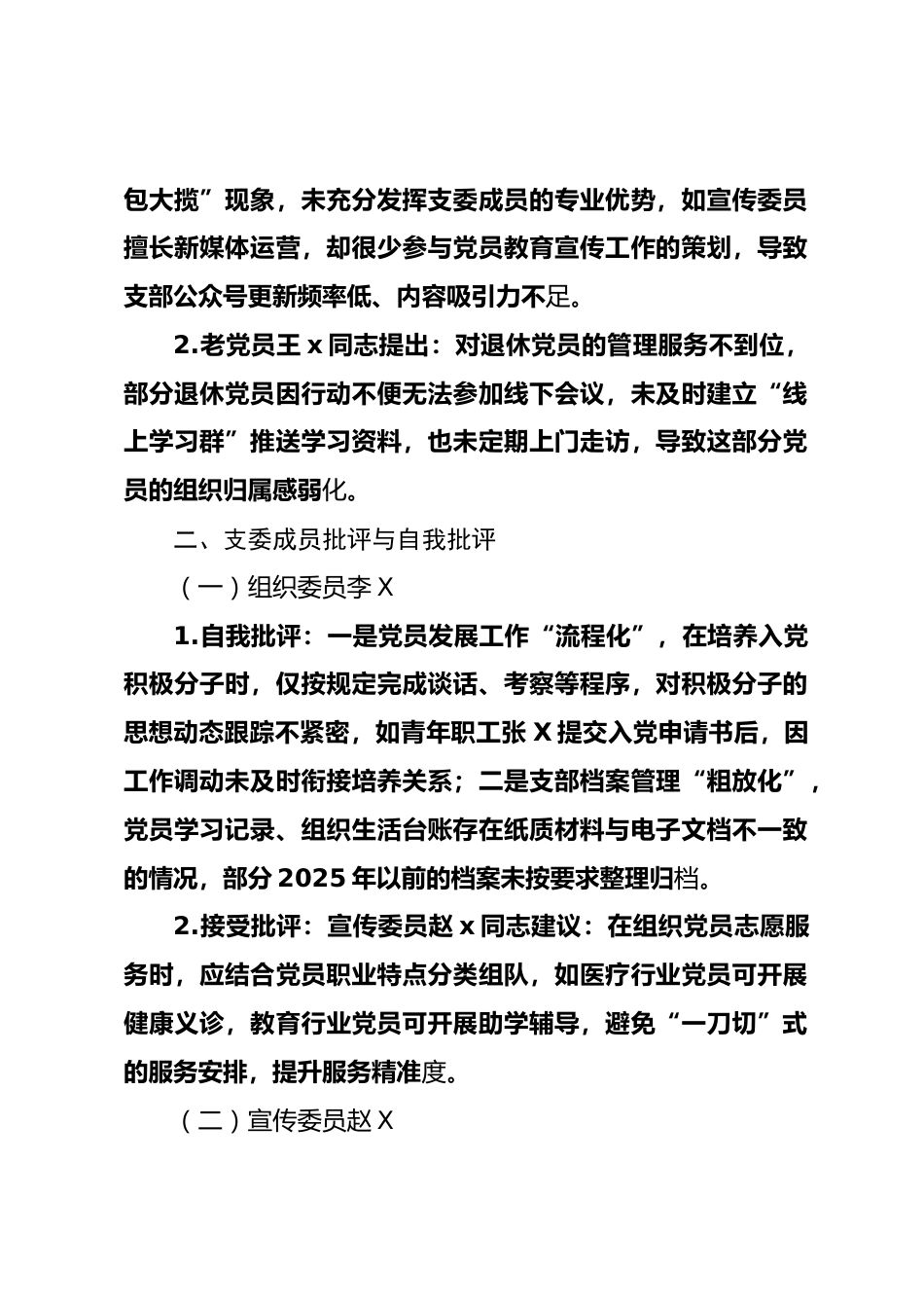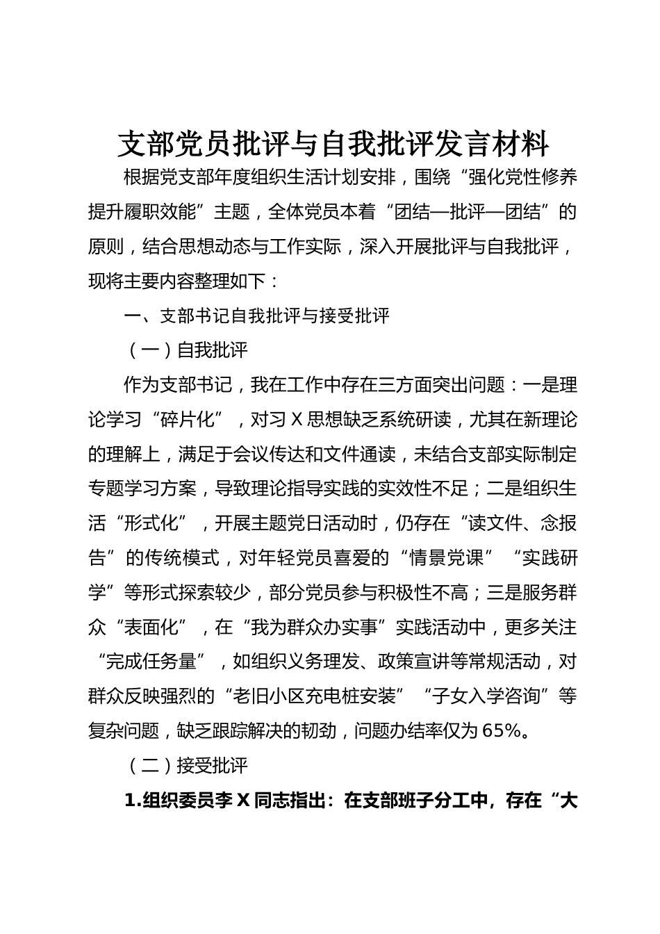 支部黨員批評與自我批評發(fā)言材料根據(jù)黨支部年度組織生活計劃安排,圍繞“強(qiáng)化黨性修養(yǎng)提升履職效能”主題,全體黨員本著“團(tuán)結(jié)—批評—團(tuán)結(jié)”的原則,結(jié)合思想動態(tài)與工作實際,深入開展批評與自我批評,現(xiàn)將主要內(nèi)容整理如下:一、支部書記自我批評與接受批評(一)自我批評作為支部書記,我在工作中存在三方面突出問題:一是理論學(xué)習(xí)“碎片化”,對習(xí)X思想缺乏系統(tǒng)研讀,尤其在新理論的理解上,滿足于會議傳達(dá)和文件通讀,未結(jié)合支部實際制定專題學(xué)習(xí)方案,導(dǎo)致理論指導(dǎo)實踐的實效性不足;二是組織生活“形式化”,開展主題黨日活動時,仍存在“讀文件、念報告”的傳統(tǒng)...