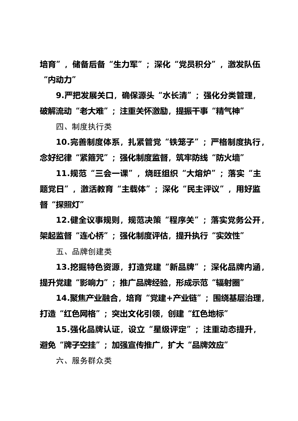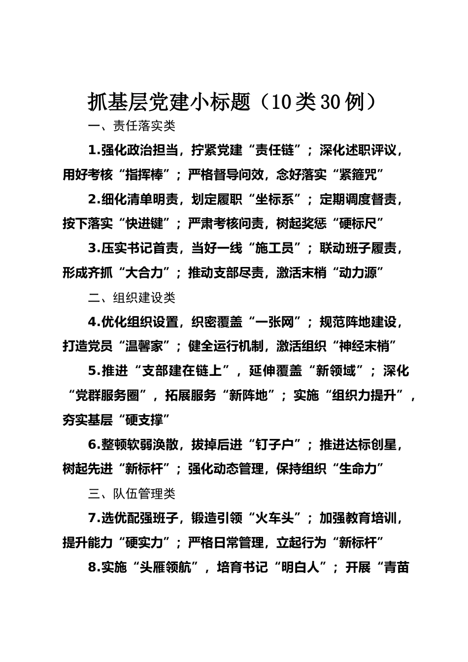 抓基層黨建小標(biāo)題(10類30例)一、責(zé)任落實類1.強(qiáng)化政治擔(dān)當(dāng),擰緊黨建“責(zé)任鏈”;深化述職評議,用好考核“指揮棒”;嚴(yán)格督導(dǎo)問效,念好落實“緊箍咒”2.細(xì)化清單明責(zé),劃定履職“坐標(biāo)系”;定期調(diào)度督責(zé),按下落實“快進(jìn)鍵”;嚴(yán)肅考核問責(zé),樹起獎懲“硬標(biāo)尺”3.壓實書記首責(zé),當(dāng)好一線“施工員”;聯(lián)動班子履責(zé),形成齊抓“大合力”;推動支部盡責(zé),激活末梢“動力源”二、組織建設(shè)類4.優(yōu)化組織設(shè)置,織密覆蓋“一張網(wǎng)”;規(guī)范陣地建設(shè),打造黨員“溫馨家”;健全運行機(jī)制,激活組織“神經(jīng)末梢”5.推進(jìn)“支部建在鏈上”,延伸覆蓋“新領(lǐng)域”;深化“黨群服務(wù)圈”,...