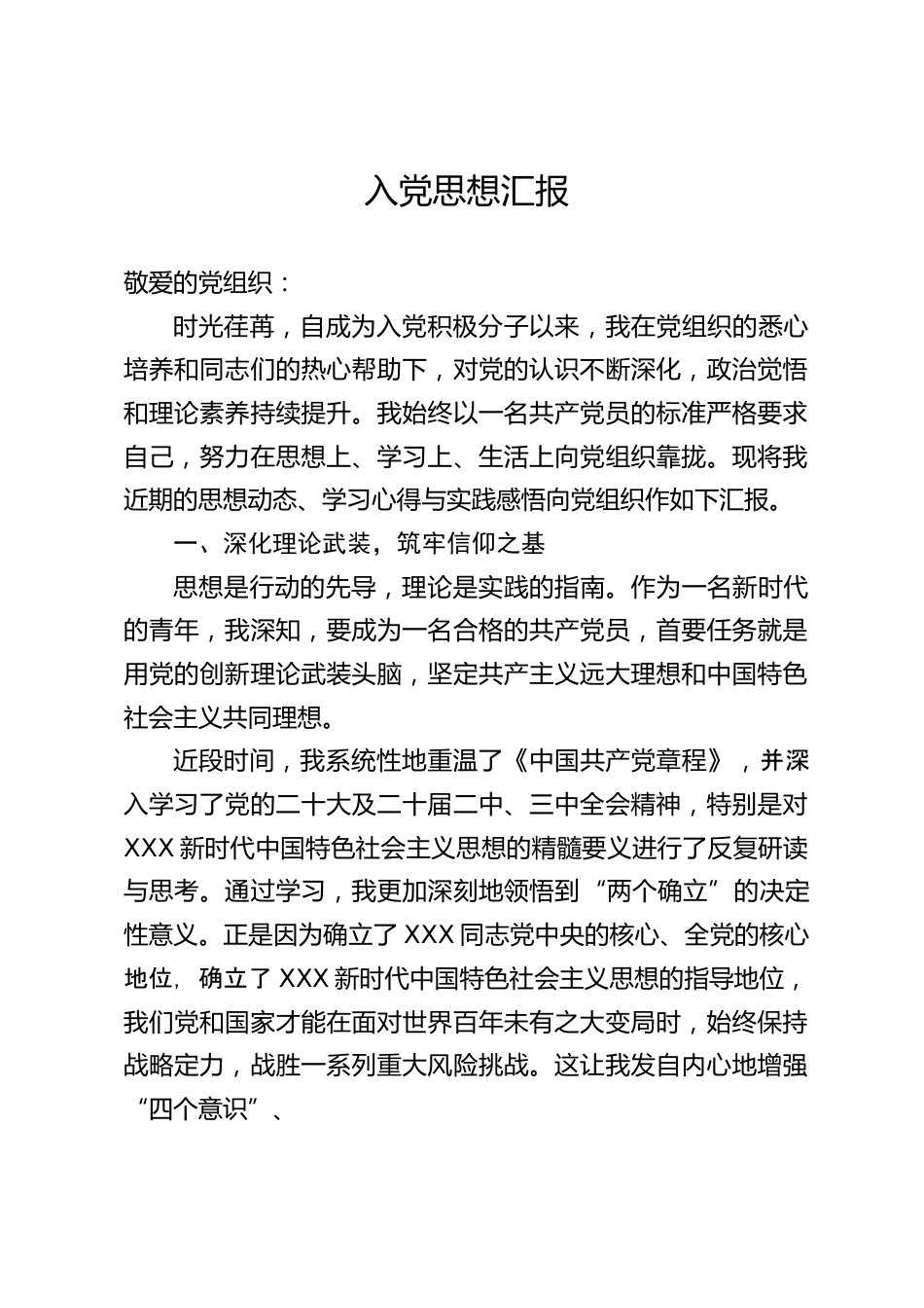 入黨思想?yún)R報(bào)敬愛(ài)的黨組織:時(shí)光荏苒,自成為入黨積極分子以來(lái),我在黨組織的悉心培養(yǎng)和同志們的熱心幫助下,對(duì)黨的認(rèn)識(shí)不斷深化,政治覺(jué)悟和理論素養(yǎng)持續(xù)提升。我始終以一名共產(chǎn)黨員的標(biāo)準(zhǔn)嚴(yán)格要求自己,努力在思想上、學(xué)習(xí)上、生活上向黨組織靠攏?,F(xiàn)將我近期的思想動(dòng)態(tài)、學(xué)習(xí)心得與實(shí)踐感悟向黨組織作如下匯報(bào)。一、深化理論武裝,筑牢信仰之基思想是行動(dòng)的先導(dǎo),理論是實(shí)踐的指南。作為一名新時(shí)代的青年,我深知,要成為一名合格的共產(chǎn)黨員,首要任務(wù)就是用黨的創(chuàng)新理論武裝頭腦,堅(jiān)定共產(chǎn)主義遠(yuǎn)大理想和中國(guó)特色社會(huì)主義共同理想。近段時(shí)間,我系統(tǒng)性地重溫了《中國(guó)...