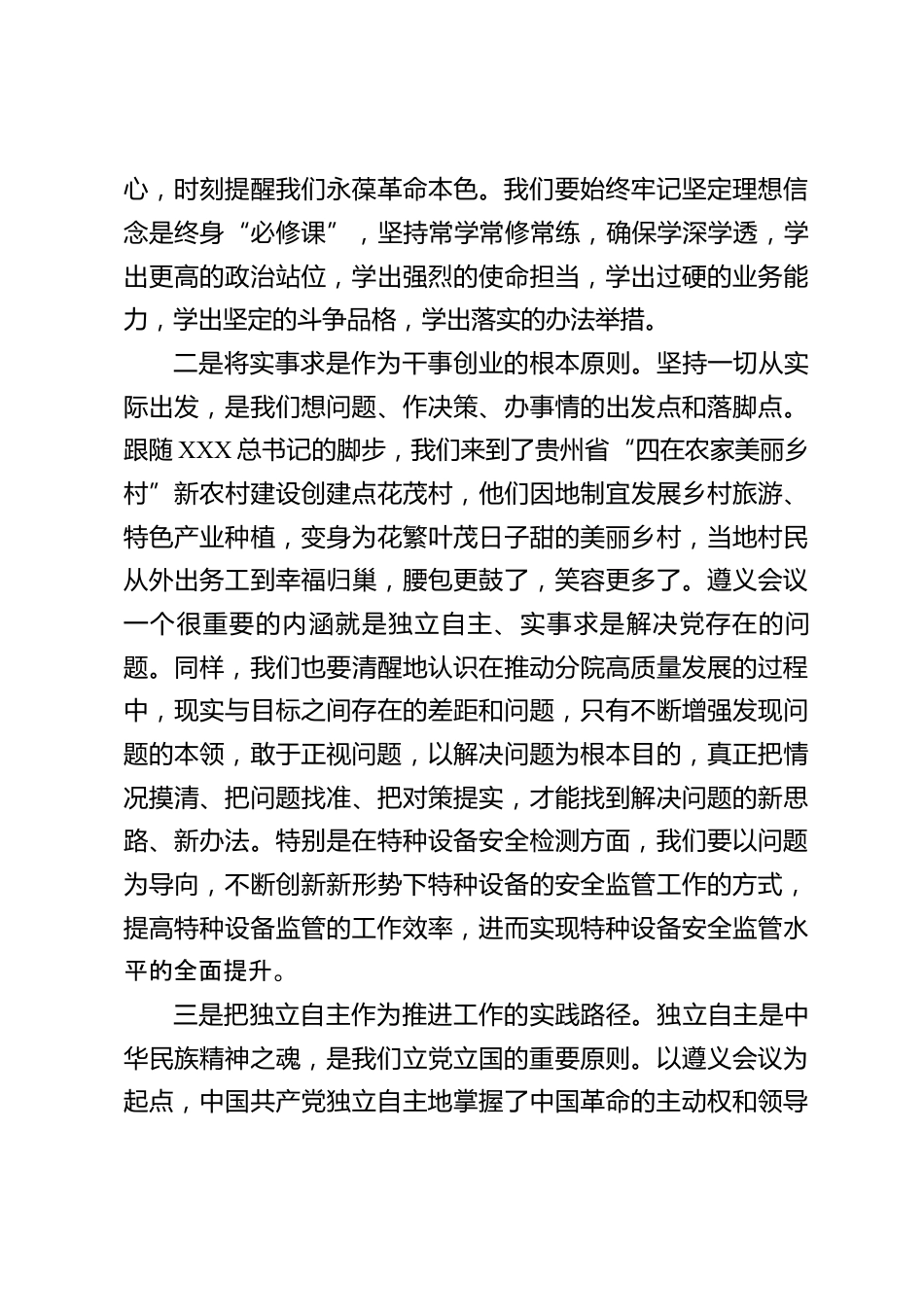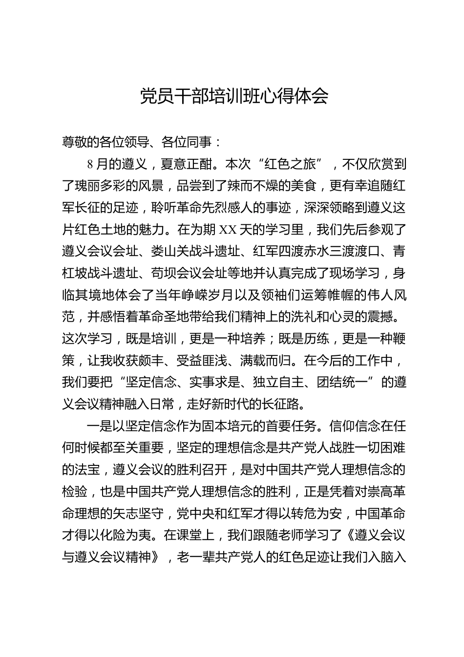 黨員干部培訓(xùn)班心得體會尊敬的各位領(lǐng)導(dǎo)、各位同事:8月的遵義,夏意正酣。本次“紅色之旅”,不僅欣賞到了瑰麗多彩的風(fēng)景,品嘗到了辣而不燥的美食,更有幸追隨紅軍長征的足跡,聆聽革命先烈感人的事跡,深深領(lǐng)略到遵義這片紅色土地的魅力。在為期XX天的學(xué)習(xí)里,我們先后參觀了遵義會議會址、婁山關(guān)戰(zhàn)斗遺址、紅軍四渡赤水三渡渡口、青杠坡戰(zhàn)斗遺址、茍壩會議會址等地并認(rèn)真完成了現(xiàn)場學(xué)習(xí),身臨其境地體會了當(dāng)年崢嶸歲月以及領(lǐng)袖們運(yùn)籌帷幄的偉人風(fēng)范,并感悟著革命圣地帶給我們精神上的洗禮和心靈的震撼。這次學(xué)習(xí),既是培訓(xùn),更是一種培養(yǎng);既是歷練,更是一種鞭策,...