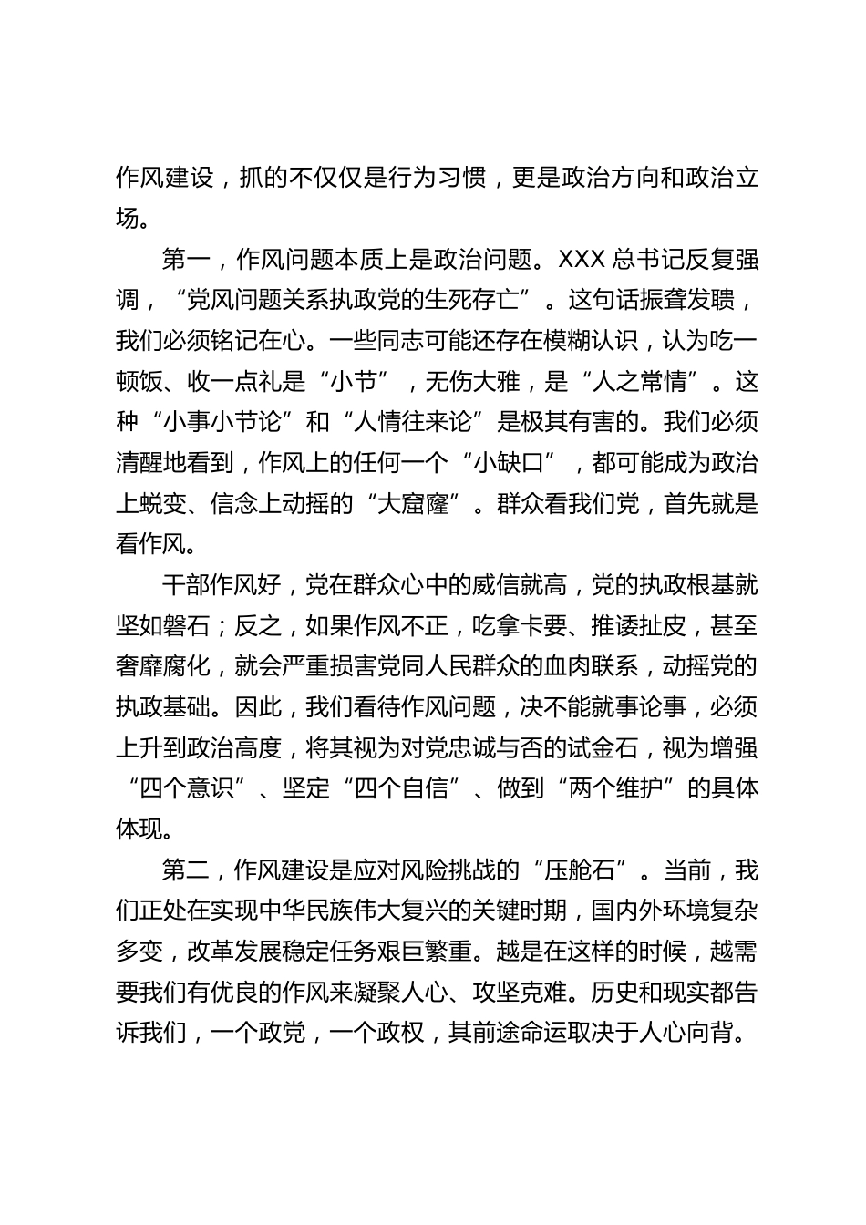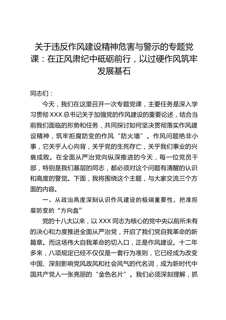 關(guān)于違反作風(fēng)建設(shè)精神危害與警示的專題黨課:在正風(fēng)肅紀(jì)中砥礪前行,以過硬作風(fēng)筑牢發(fā)展基石同志們:今天,我們在這里召開一次專題黨課,主要任務(wù)是深入學(xué)習(xí)貫徹XXX總書記關(guān)于加強黨的作風(fēng)建設(shè)的重要論述,結(jié)合當(dāng)前我們面臨的形勢和任務(wù),共同探討如何堅決貫徹落實作風(fēng)建設(shè)精神,筑牢拒腐防變的作風(fēng)“防火墻”。作風(fēng)問題絕非小事,它關(guān)乎人心向背,關(guān)乎黨的生死存亡,關(guān)乎我們事業(yè)的興衰成敗。在全面從嚴(yán)治黨向縱深推進的今天,每一位黨員干部,特別是我們基層的同志,都必須對這個問題有清醒的認識和高度的警覺。下面,我將圍繞這個主題,與大家交流三個方面的內(nèi)容。一...