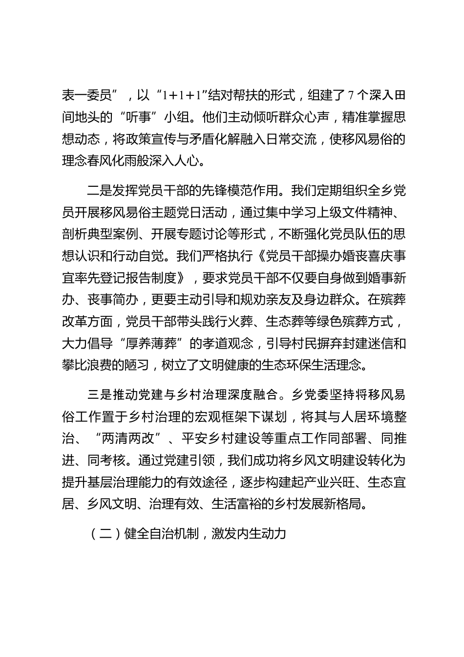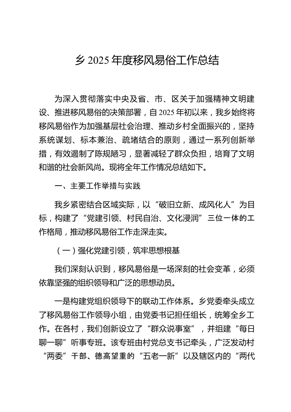 鄉(xiāng)2025年度移風易俗工作總結(jié)為深入貫徹落實中央及省、市、區(qū)關于加強精神文明建設、推進移風易俗的決策部署,自2025年初以來,我鄉(xiāng)始終將移風易俗作為加強基層社會治理、推動鄉(xiāng)村全面振興的,堅持系統(tǒng)謀劃、標本兼治、疏堵結(jié)合的原則,通過一系列創(chuàng)新舉措,有效遏制了陳規(guī)陋習,顯著減輕了群眾負擔,培育了文明和諧的社會新風尚。現(xiàn)將全年工作情況總結(jié)如下。一、主要工作舉措與實踐我鄉(xiāng)緊密結(jié)合區(qū)域?qū)嶋H,以“破舊立新、成風化人”為目標,構(gòu)建了“黨建引領、村民自治、文化浸潤”三位一體的工作格局,推動移風易俗工作走深走實。(一)強化黨建引領,筑牢思想根基我們深...