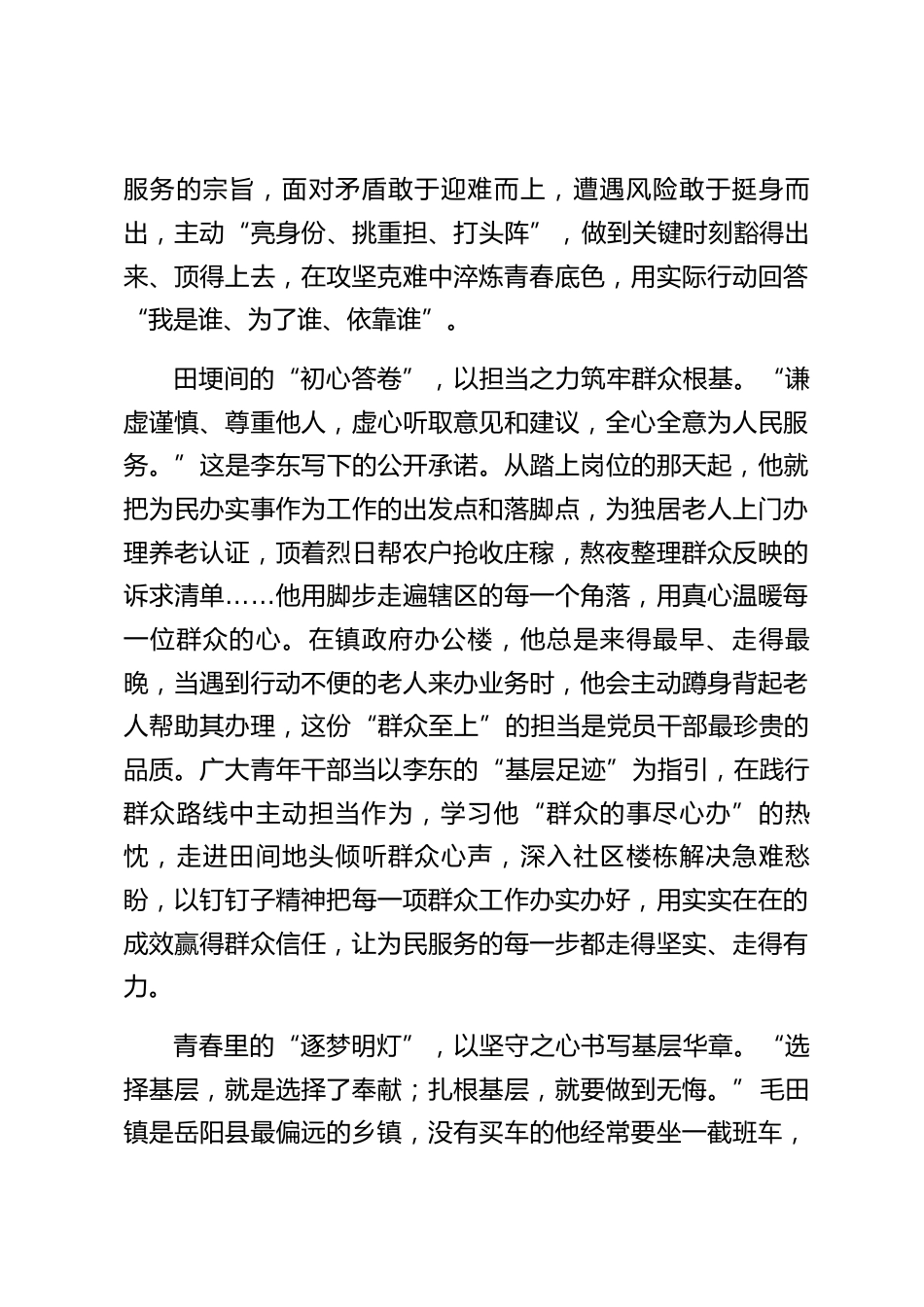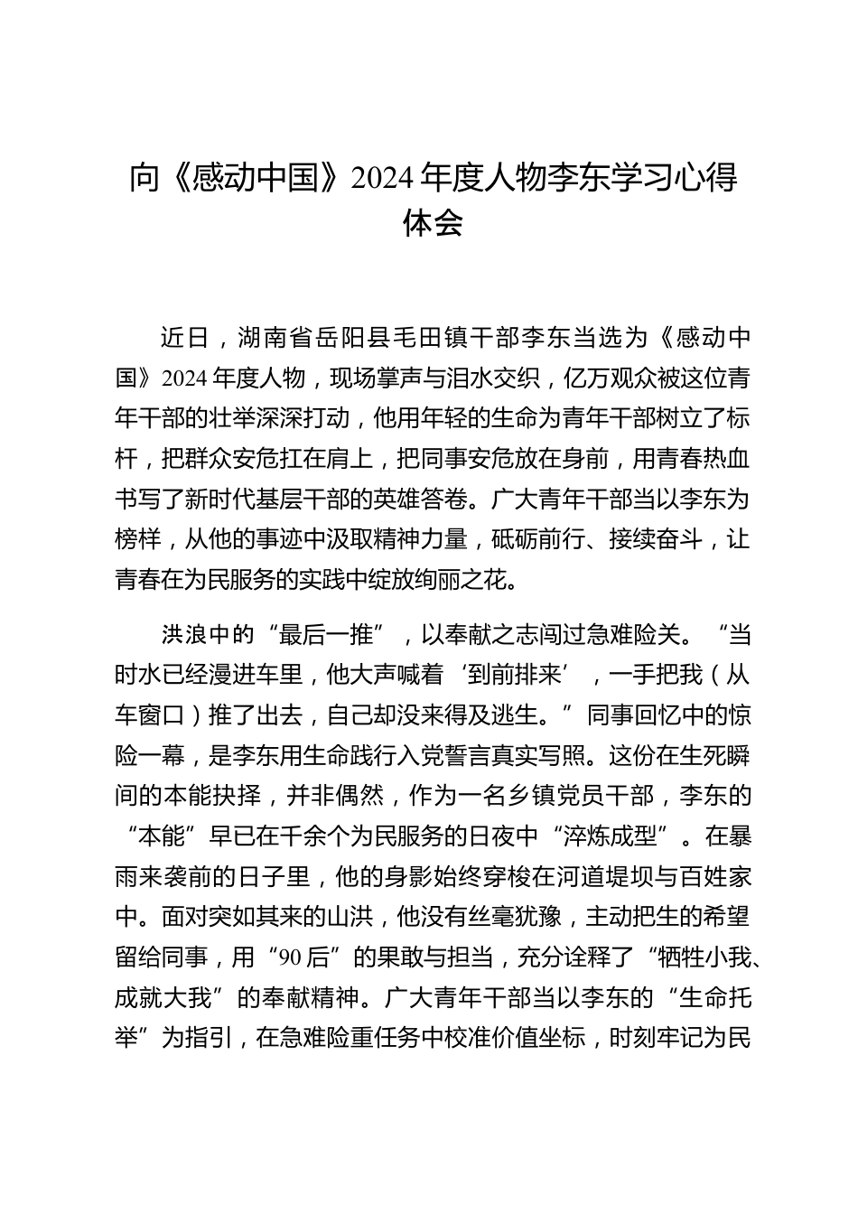向《感動中國》2024年度人物李東學習心得體會近日,湖南省岳陽縣毛田鎮(zhèn)干部李東當選為《感動中國》2024年度人物,現(xiàn)場掌聲與淚水交織,億萬觀眾被這位青年干部的壯舉深深打動,他用年輕的生命為青年干部樹立了標桿,把群眾安??冈诩缟?,把同事安危放在身前,用青春熱血書寫了新時代基層干部的英雄答卷。廣大青年干部當以李東為榜樣,從他的事跡中汲取精神力量,砥礪前行、接續(xù)奮斗,讓青春在為民服務的實踐中綻放絢麗之花。洪浪中的“最后一推”,以奉獻之志闖過急難險關?!爱敃r水已經漫進車里,他大聲喊著‘到前排來’,一手把我(從車窗口)推了出去,自己卻沒來得及...