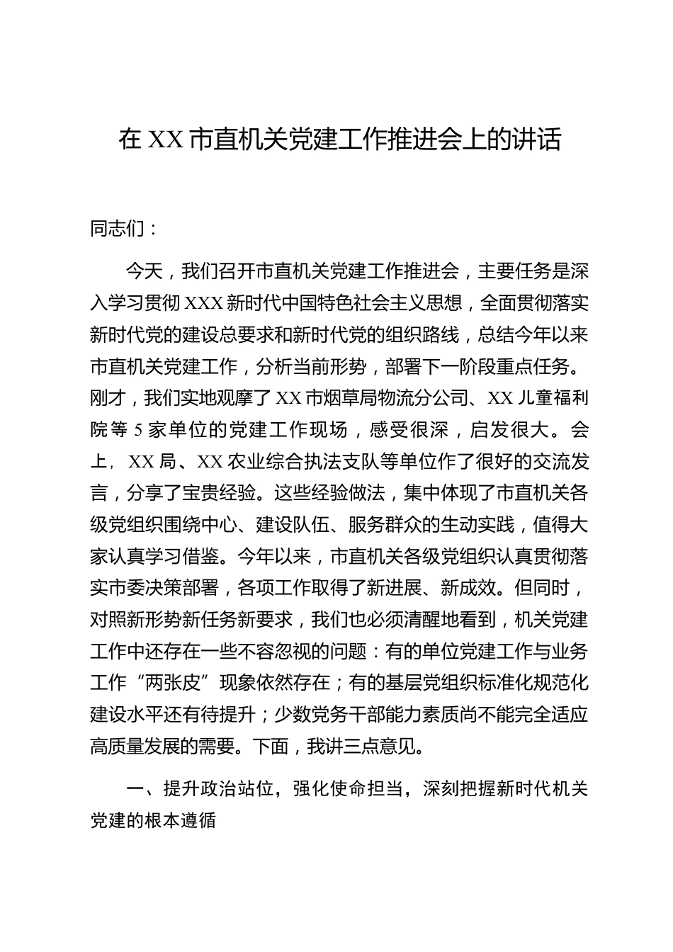 在XX市直機(jī)關(guān)黨建工作推進(jìn)會(huì)上的講話同志們:今天,我們召開(kāi)市直機(jī)關(guān)黨建工作推進(jìn)會(huì),主要任務(wù)是深入學(xué)習(xí)貫徹XXX新時(shí)代中國(guó)特色社會(huì)主義思想,全面貫徹落實(shí)新時(shí)代黨的建設(shè)總要求和新時(shí)代黨的組織路線,總結(jié)今年以來(lái)市直機(jī)關(guān)黨建工作,分析當(dāng)前形勢(shì),部署下一階段重點(diǎn)任務(wù)。剛才,我們實(shí)地觀摩了XX市煙草局物流分公司、XX兒童福利院等5家單位的黨建工作現(xiàn)場(chǎng),感受很深,啟發(fā)很大。會(huì)上,XX局、XX農(nóng)業(yè)綜合執(zhí)法支隊(duì)等單位作了很好的交流發(fā)言,分享了寶貴經(jīng)驗(yàn)。這些經(jīng)驗(yàn)做法,集中體現(xiàn)了市直機(jī)關(guān)各級(jí)黨組織圍繞中心、建設(shè)隊(duì)伍、服務(wù)群眾的生動(dòng)實(shí)踐,值得大家認(rèn)真學(xué)習(xí)借鑒。今...