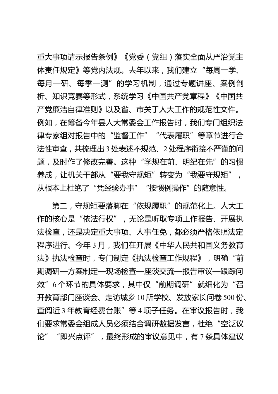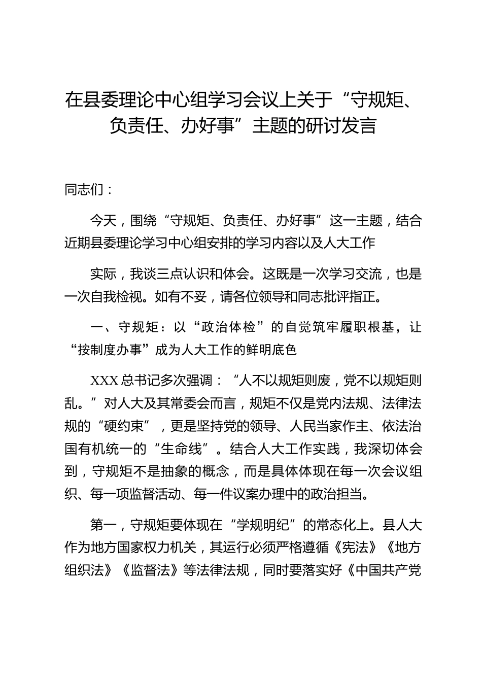 在縣委理論中心組學(xué)習(xí)會(huì)議上關(guān)于“守規(guī)矩、負(fù)責(zé)任、辦好事”主題的研討發(fā)言同志們:今天,圍繞“守規(guī)矩、負(fù)責(zé)任、辦好事”這一主題,結(jié)合近期縣委理論學(xué)習(xí)中心組安排的學(xué)習(xí)內(nèi)容以及人大工作實(shí)際,我談三點(diǎn)認(rèn)識(shí)和體會(huì)。這既是一次學(xué)習(xí)交流,也是一次自我檢視。如有不妥,請(qǐng)各位領(lǐng)導(dǎo)和同志批評(píng)指正。一、守規(guī)矩:以“政治體檢”的自覺(jué)筑牢履職根基,讓“按制度辦事”成為人大工作的鮮明底色XXX總書記多次強(qiáng)調(diào):“人不以規(guī)矩則廢,黨不以規(guī)矩則亂?!睂?duì)人大及其常委會(huì)而言,規(guī)矩不僅是黨內(nèi)法規(guī)、法律法規(guī)的“硬約束”,更是堅(jiān)持黨的領(lǐng)導(dǎo)、人民當(dāng)家作主、依法治國(guó)有機(jī)統(tǒng)一的...