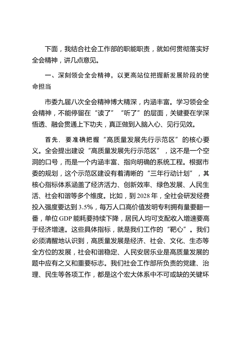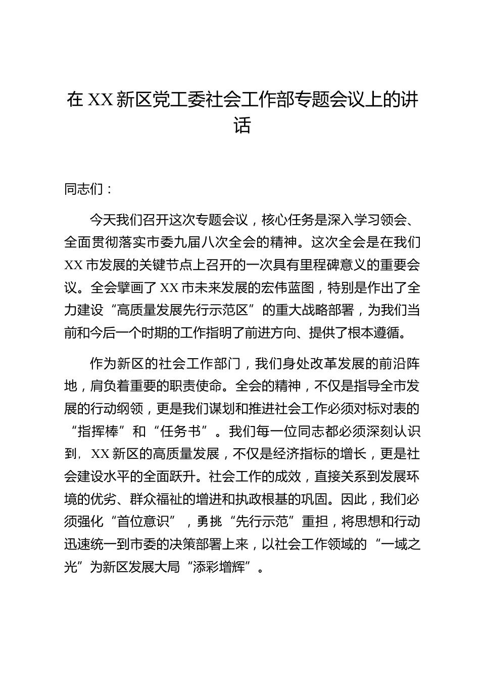 在XX新區(qū)黨工委社會工作部專題會議上的講話同志們:今天我們召開這次專題會議,核心任務(wù)是深入學(xué)習(xí)領(lǐng)會、全面貫徹落實市委九屆八次全會的精神。這次全會是在我們XX市發(fā)展的關(guān)鍵節(jié)點上召開的一次具有里程碑意義的重要會議。全會擘畫了XX市未來發(fā)展的宏偉藍(lán)圖,特別是作出了全力建設(shè)“高質(zhì)量發(fā)展先行示范區(qū)”的重大戰(zhàn)略部署,為我們當(dāng)前和今后一個時期的工作指明了前進方向、提供了根本遵循。作為新區(qū)的社會工作部門,我們身處改革發(fā)展的前沿陣地,肩負(fù)著重要的職責(zé)使命。全會的精神,不僅是指導(dǎo)全市發(fā)展的行動綱領(lǐng),更是我們謀劃和推進社會工作必須對標(biāo)對表的“指揮棒”和...