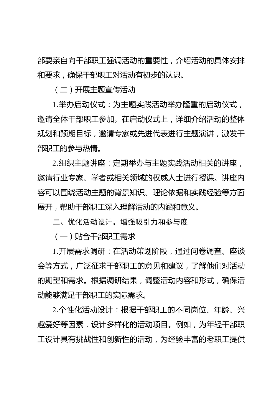 關(guān)于干部職工對主題實踐活動了解不深入的整改措施主題實踐活動是提升干部職工綜合素質(zhì)、推動單位工作發(fā)展的重要載體。然而,當(dāng)干部職工對主題實踐活動了解不深入時,活動的效果將大打折扣。為解決這一問題,特制定以下整改措施。一、加強宣傳引導(dǎo),營造濃厚氛圍(一)豐富宣傳渠道1.傳統(tǒng)媒體宣傳:利用單位內(nèi)部的宣傳欄、黑板報等傳統(tǒng)宣傳陣地,定期更新主題實踐活動的相關(guān)內(nèi)容,包括活動的背景、目標(biāo)、主要內(nèi)容和進(jìn)展情況等。設(shè)計制作宣傳海報和宣傳手冊,發(fā)放到干部職工手中,方便他們隨時了解活動信息。2.新媒體宣傳:充分利用單位官方網(wǎng)站、公眾號、微博等新媒體平臺...