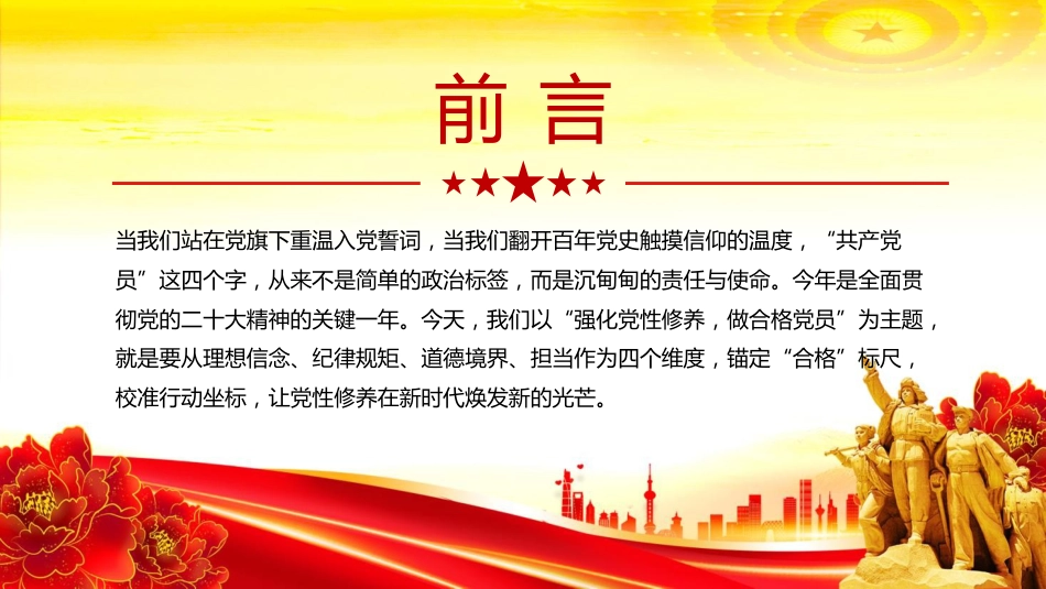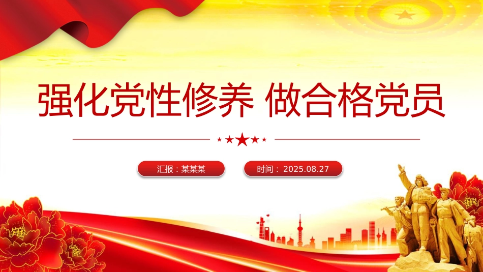 強(qiáng)化黨性修養(yǎng)做合格黨員匯報:某某某時間:2025.08.27當(dāng)我們站在黨旗下重溫入黨誓詞,當(dāng)我們翻開百年黨史觸摸信仰的溫度,“共產(chǎn)黨員”這四個字,從來不是簡單的政治標(biāo)簽,而是沉甸甸的責(zé)任與使命。今年是全面貫徹黨的二十大精神的關(guān)鍵一年。今天,我們以“強(qiáng)化黨性修養(yǎng),做合格黨員”為主題,就是要從理想信念、紀(jì)律規(guī)矩、道德境界、擔(dān)當(dāng)作為四個維度,錨定“合格”標(biāo)尺,校準(zhǔn)行動坐標(biāo),讓黨性修養(yǎng)在新時代煥發(fā)新的光芒。前言01堅定理想信念,補足精神之鈣,在信仰燈塔下校準(zhǔn)人生航向堅定理想信念,補足精神之鈣,在信仰燈塔下校準(zhǔn)人生航向?(一)理想信念是黨員的“精...