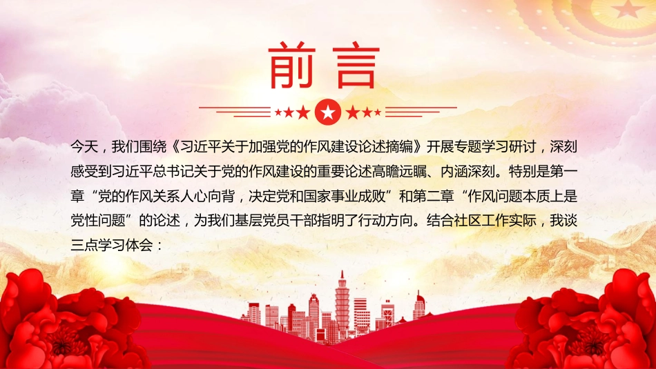 不忘初心黨政黨建工作匯報認真學(xué)習(xí)、貫徹和領(lǐng)會上級各項方針、政策、法規(guī);維護黨的團結(jié)和統(tǒng)一,對黨忠誠老實,言行一致;密切聯(lián)系群眾,向群眾宣傳黨的主張,遇事同群眾商量不忘初心黨政黨建工作匯報認真學(xué)習(xí)、貫徹和領(lǐng)會上級各項方針、政策、法規(guī);維護黨的團結(jié)和統(tǒng)一,對黨忠誠老實,言行一致;密切聯(lián)系群眾,向群眾宣傳黨的主張,遇事同群眾商量以優(yōu)良作風(fēng)筑牢基層堡壘用心用情服務(wù)人民群眾授課人:某某某時間:2025.08.21學(xué)習(xí)《習(xí)近平關(guān)于加強黨的作風(fēng)建設(shè)論述摘編》研討發(fā)言材料不忘初心黨政黨建工作匯報認真學(xué)習(xí)、貫徹和領(lǐng)會上級各項方針、政策、法規(guī);維護黨的團...