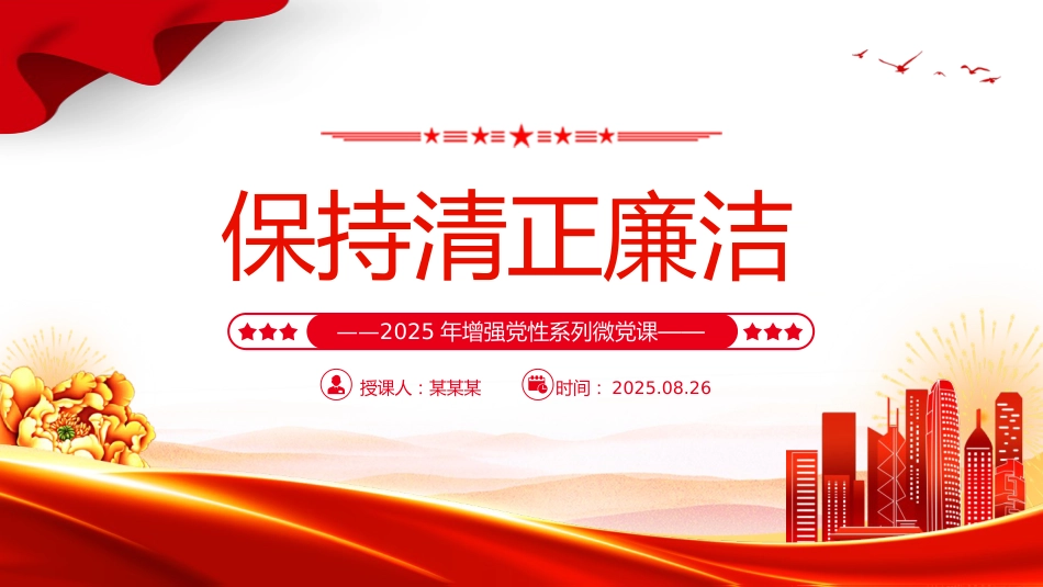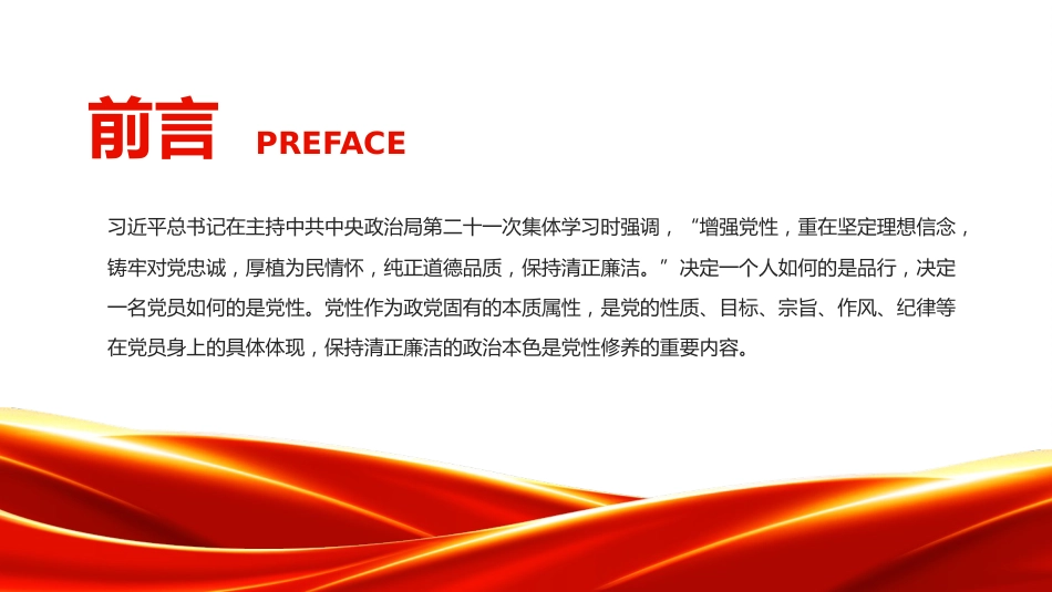 保持清正廉潔——2025年增強(qiáng)黨性系列微黨課——授課人:某某某時(shí)間:2025.08.26前言PREFACE習(xí)近平總書記在主持中共中央政治局第二十一次集體學(xué)習(xí)時(shí)強(qiáng)調(diào),“增強(qiáng)黨性,重在堅(jiān)定理想信念,鑄牢對(duì)黨忠誠(chéng),厚植為民情懷,純正道德品質(zhì),保持清正廉潔?!睕Q定一個(gè)人如何的是品行,決定一名黨員如何的是黨性。黨性作為政黨固有的本質(zhì)屬性,是黨的性質(zhì)、目標(biāo)、宗旨、作風(fēng)、紀(jì)律等在黨員身上的具體體現(xiàn),保持清正廉潔的政治本色是黨性修養(yǎng)的重要內(nèi)容。自我們黨誕生之日起,就把清正廉潔作為必備的政治品格鐫刻在黨的旗幟上。從1926年黨中央頒布的第一部懲治貪污腐化分子的文件《...