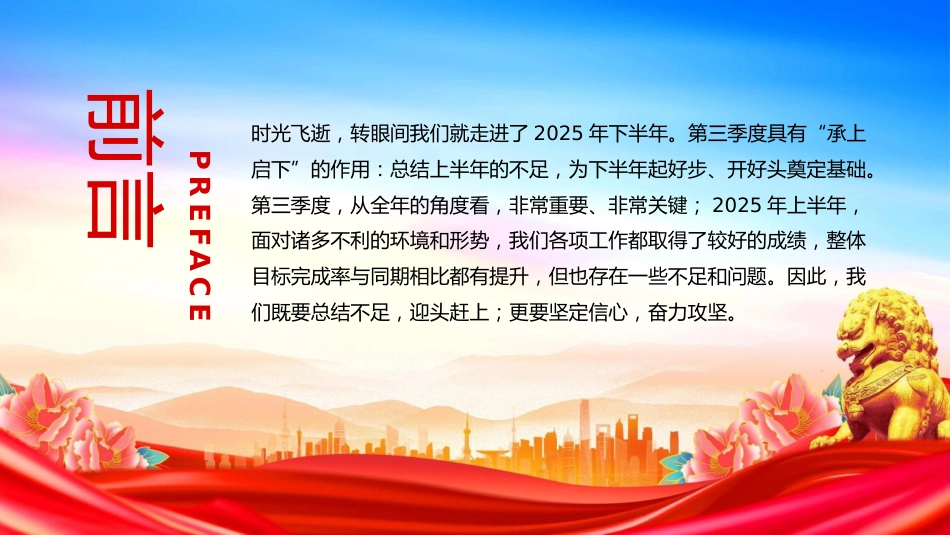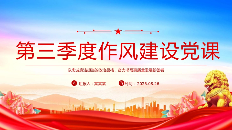 第三季度作風(fēng)建設(shè)黨課以忠誠(chéng)廉潔擔(dān)當(dāng)?shù)恼纹犯瘢瑠^力書(shū)寫(xiě)高質(zhì)量發(fā)展新答卷匯報(bào)人:某某某時(shí)間:2025.08.26前言PREFACE時(shí)光飛逝,轉(zhuǎn)眼間我們就走進(jìn)了2025年下半年。第三季度具有“承上啟下”的作用:總結(jié)上半年的不足,為下半年起好步、開(kāi)好頭奠定基礎(chǔ)。第三季度,從全年的角度看,非常重要、非常關(guān)鍵;2025年上半年,面對(duì)諸多不利的環(huán)境和形勢(shì),我們各項(xiàng)工作都取得了較好的成績(jī),整體目標(biāo)完成率與同期相比都有提升,但也存在一些不足和問(wèn)題。因此,我們既要總結(jié)不足,迎頭趕上;更要堅(jiān)定信心,奮力攻堅(jiān)。前言PREFACE選擇在今天和大家一起交流、探討,目的就是增強(qiáng)大家的...