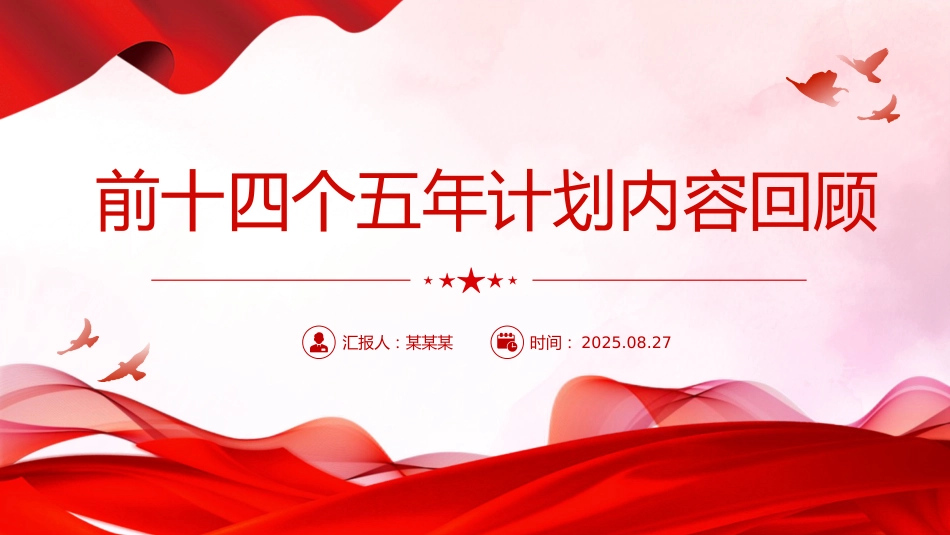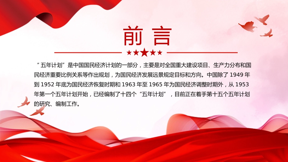 前十四個(gè)五年計(jì)劃內(nèi)容回顧匯報(bào)人:某某某時(shí)間:2025.08.27“五年計(jì)劃”是中國(guó)國(guó)民經(jīng)濟(jì)計(jì)劃的一部分,主要是對(duì)全國(guó)重大建設(shè)項(xiàng)目、生產(chǎn)力分布和國(guó)民經(jīng)濟(jì)重要比例關(guān)系等作出規(guī)劃,為國(guó)民經(jīng)濟(jì)發(fā)展遠(yuǎn)景規(guī)定目標(biāo)和方向。中國(guó)除了1949年到1952年底為國(guó)民經(jīng)濟(jì)恢復(fù)時(shí)期和1963年至1965年為國(guó)民經(jīng)濟(jì)調(diào)整時(shí)期外,從1953年第一個(gè)五年計(jì)劃開(kāi)始,已經(jīng)編制了十四個(gè)“五年計(jì)劃”,目前正在著手第十五個(gè)五年計(jì)劃的研究、編制工作。前言第一部分中華人民共和國(guó)第一個(gè)五年計(jì)劃(1953-1957年)第一部分//PART01第一個(gè)五年計(jì)劃“一五”計(jì)劃,是指我國(guó)從1953年到1957年發(fā)展國(guó)民經(jīng)濟(jì)的計(jì)劃。它是...
