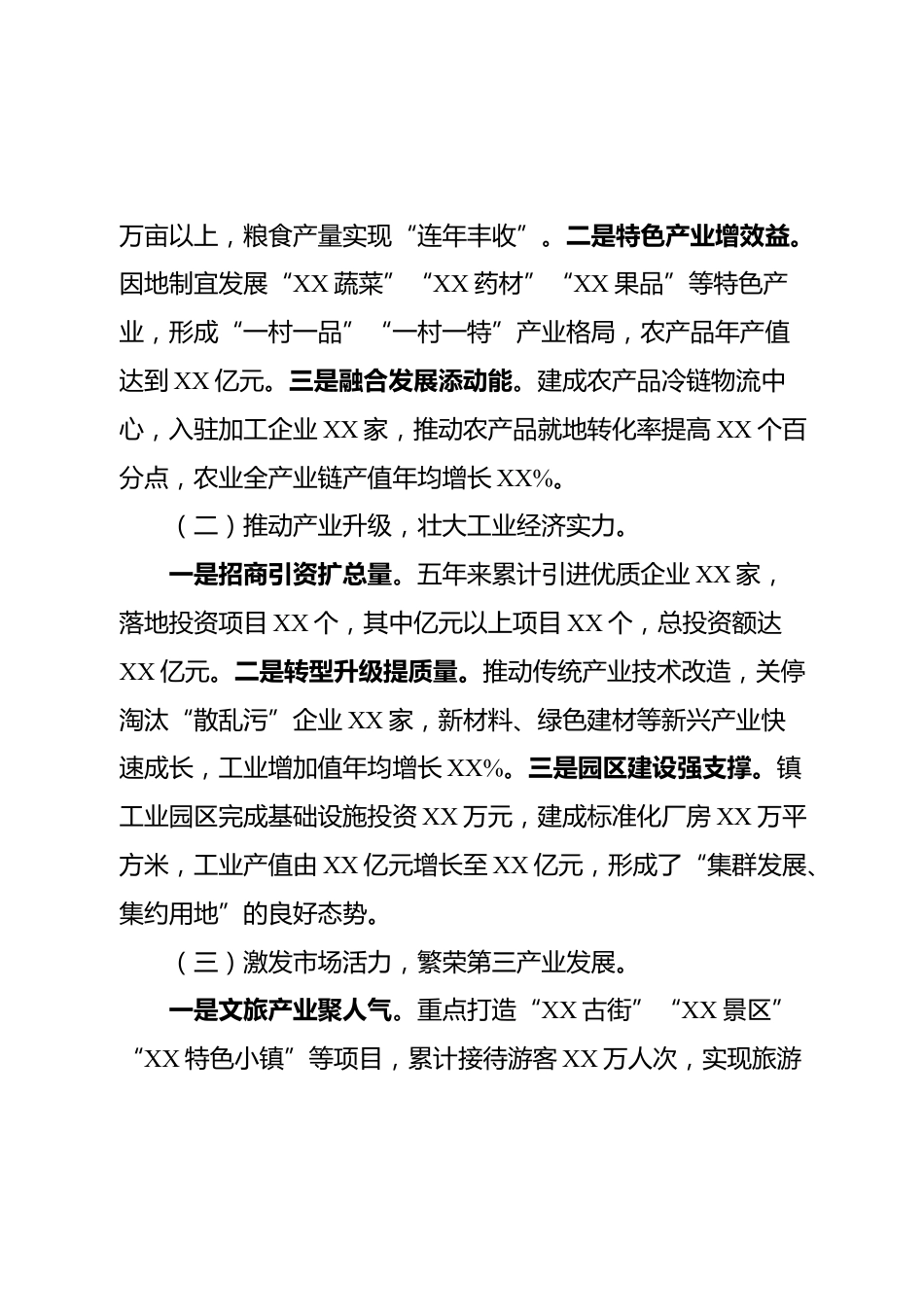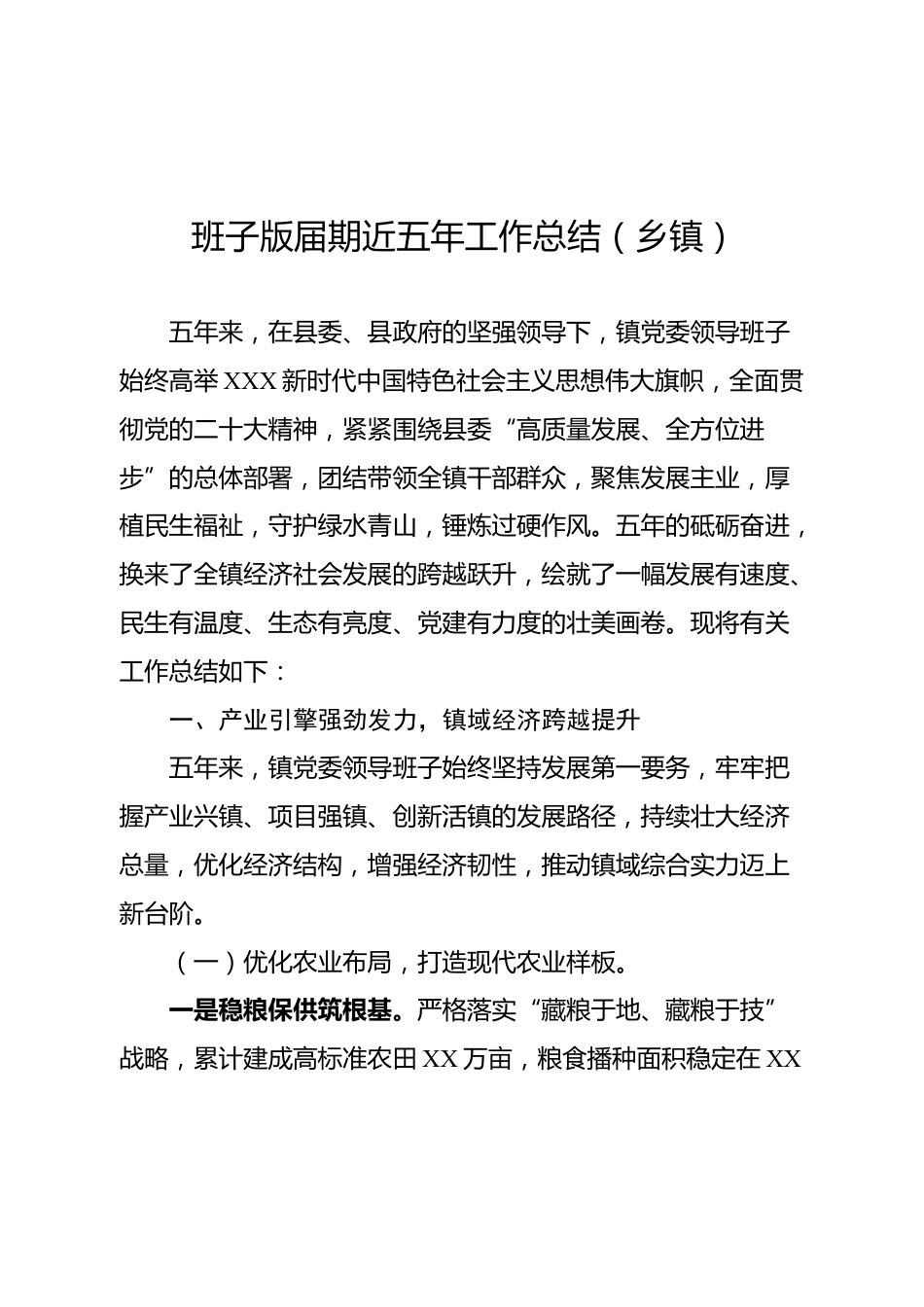 班子版屆期近五年工作總結(jié)(鄉(xiāng)鎮(zhèn))五年來(lái),在縣委、縣政府的堅(jiān)強(qiáng)領(lǐng)導(dǎo)下,鎮(zhèn)黨委領(lǐng)導(dǎo)班子始終高舉XXX新時(shí)代中國(guó)特色社會(huì)主義思想偉大旗幟,全面貫徹黨的二十大精神,緊緊圍繞縣委“高質(zhì)量發(fā)展、全方位進(jìn)步”的總體部署,團(tuán)結(jié)帶領(lǐng)全鎮(zhèn)干部群眾,聚焦發(fā)展主業(yè),厚植民生福祉,守護(hù)綠水青山,錘煉過(guò)硬作風(fēng)。五年的砥礪奮進(jìn),換來(lái)了全鎮(zhèn)經(jīng)濟(jì)社會(huì)發(fā)展的跨越躍升,繪就了一幅發(fā)展有速度、民生有溫度、生態(tài)有亮度、黨建有力度的壯美畫(huà)卷。現(xiàn)將有關(guān)工作總結(jié)如下:一、產(chǎn)業(yè)引擎強(qiáng)勁發(fā)力,鎮(zhèn)域經(jīng)濟(jì)跨越提升五年來(lái),鎮(zhèn)黨委領(lǐng)導(dǎo)班子始終堅(jiān)持發(fā)展第一要?jiǎng)?wù),牢牢把握產(chǎn)業(yè)興鎮(zhèn)、項(xiàng)目強(qiáng)鎮(zhèn)...