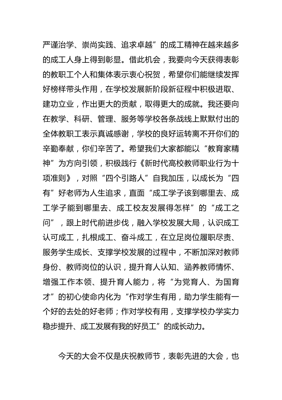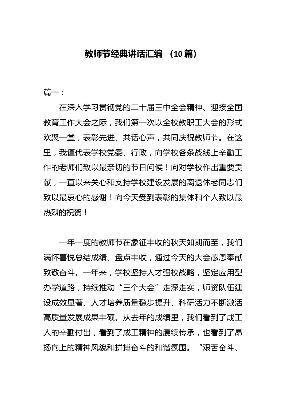 教師節(jié)經(jīng)典講話匯編(10篇)篇一:在深入學(xué)習(xí)貫徹黨的二十屆三中全會(huì)精神、迎接全國教育工作大會(huì)之際,我們第一次以全校教職工大會(huì)的形式歡聚一堂,表彰先進(jìn)、共話心聲,共同慶祝教師節(jié)。在這里,我謹(jǐn)代表學(xué)校黨委、行政,向?qū)W校各條戰(zhàn)線上辛勤工作的老師們致以最親切的節(jié)日問候!向?qū)W(xué)校作出重要貢獻(xiàn),一直以來關(guān)心和支持學(xué)校建設(shè)發(fā)展的離退休老同志們致以最衷心的感謝!向今天受到表彰的集體和個(gè)人致以最熱烈的祝賀!一年一度的教師節(jié)在象征豐收的秋天如期而至,我們滿懷喜悅總結(jié)成績(jī)、盤點(diǎn)豐收,通過今天的大會(huì)感恩奉獻(xiàn)致敬奮斗。一年來,學(xué)校堅(jiān)持人才強(qiáng)校戰(zhàn)略,堅(jiān)定...
