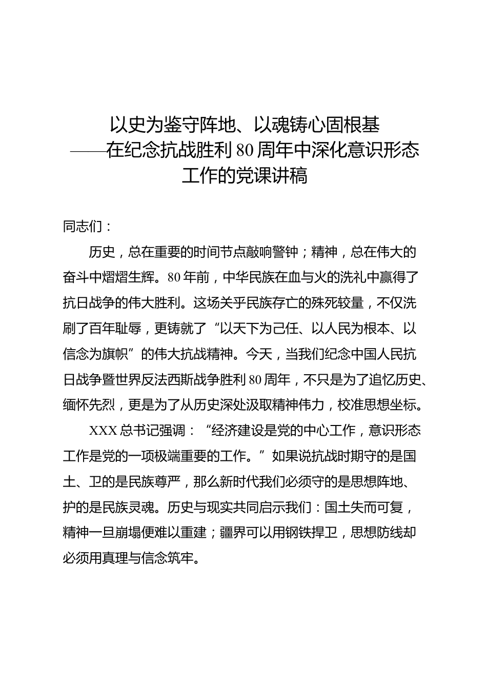 以史為鑒守陣地、以魂鑄心固根基——在紀(jì)念抗戰(zhàn)勝利80周年中深化意識形態(tài)工作的黨課講稿同志們:歷史,總在重要的時間節(jié)點敲響警鐘;精神,總在偉大的奮斗中熠熠生輝。80年前,中華民族在血與火的洗禮中贏得了抗日戰(zhàn)爭的偉大勝利。這場關(guān)乎民族存亡的殊死較量,不僅洗刷了百年恥辱,更鑄就了“以天下為己任、以人民為根本、以信念為旗幟”的偉大抗戰(zhàn)精神。今天,當(dāng)我們紀(jì)念中國人民抗日戰(zhàn)爭暨世界反法西斯戰(zhàn)爭勝利80周年,不只是為了追憶歷史、緬懷先烈,更是為了從歷史深處汲取精神偉力,校準(zhǔn)思想坐標(biāo)。XXX總書記強調(diào):“經(jīng)濟(jì)建設(shè)是黨的中心工作,意識形態(tài)工作是黨的一...