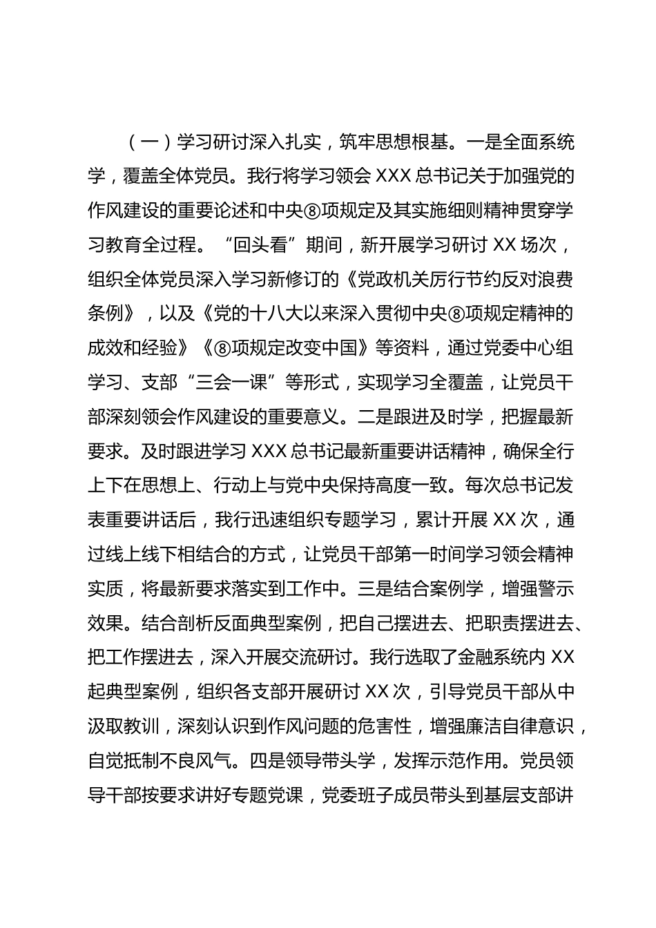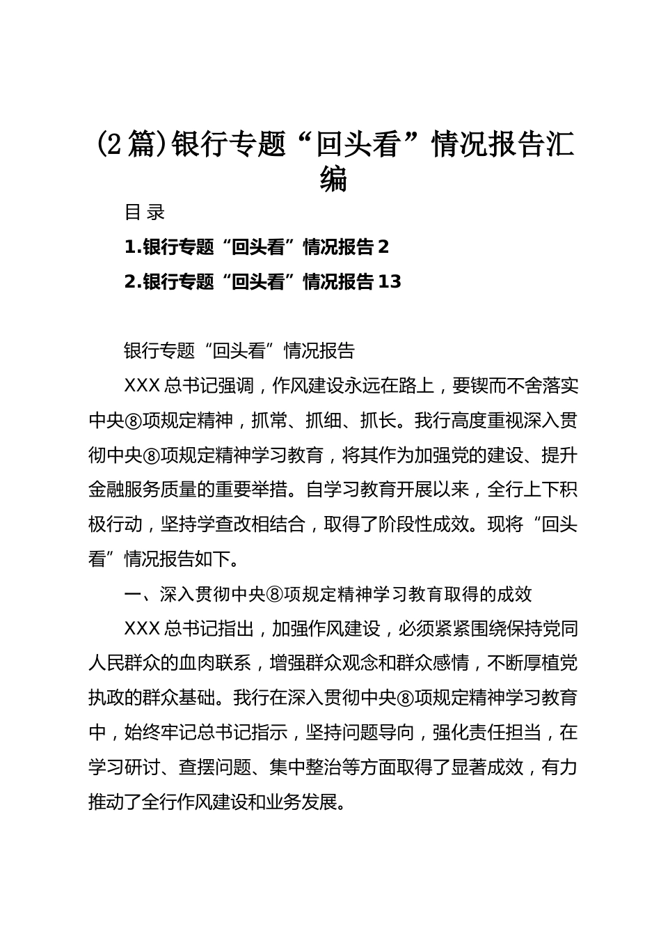 (2篇)銀行專題“回頭看”情況報告匯編目錄1.銀行專題“回頭看”情況報告22.銀行專題“回頭看”情況報告13銀行專題“回頭看”情況報告XXX總書記強調(diào),作風建設(shè)永遠在路上,要鍥而不舍落實中央⑧項規(guī)定精神,抓常、抓細、抓長。我行高度重視深入貫徹中央⑧項規(guī)定精神學習教育,將其作為加強黨的建設(shè)、提升金融服務(wù)質(zhì)量的重要舉措。自學習教育開展以來,全行上下積極行動,堅持學查改相結(jié)合,取得了階段性成效?,F(xiàn)將“回頭看”情況報告如下。一、深入貫徹中央⑧項規(guī)定精神學習教育取得的成效XXX總書記指出,加強作風建設(shè),必須緊緊圍繞保持黨同人民群眾的血肉聯(lián)系,增強群眾...