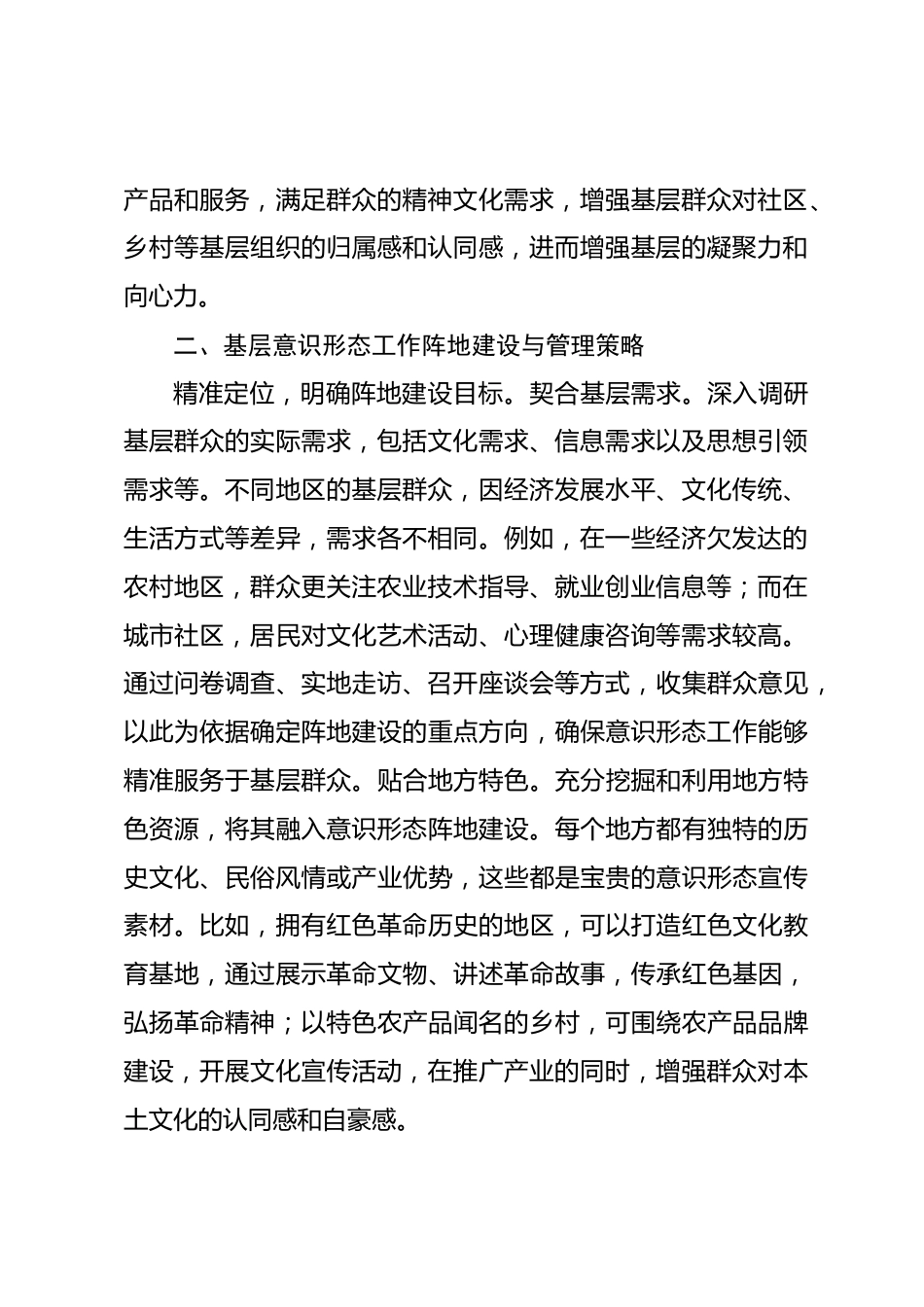 (5篇)做好意識形態(tài)工作主題經(jīng)驗(yàn)交流材料匯編關(guān)于基層做好意識形態(tài)工作陣地建設(shè)與管理的策略的分析基層作為國家治理體系的基礎(chǔ)單元,是意識形態(tài)工作的前沿陣地。加強(qiáng)基層意識形態(tài)工作陣地建設(shè)與管理,對于凝聚廣大群眾的思想共識,推動黨和國家各項(xiàng)事業(yè)在基層順利開展,具有不可替代的重要作用。一、做好基層意識形態(tài)工作陣地建設(shè)與管理的意義基層是黨執(zhí)政的根基所在,意識形態(tài)陣地建設(shè)與管理能確?;鶎狱h員干部和群眾在思想上、政治上同黨中央保持高度一致,增強(qiáng)對黨的理論和路線方針政策的認(rèn)同和擁護(hù),鞏固黨在基層的執(zhí)政地位。通過加強(qiáng)基層意識形態(tài)陣地建設(shè)與管理,能...