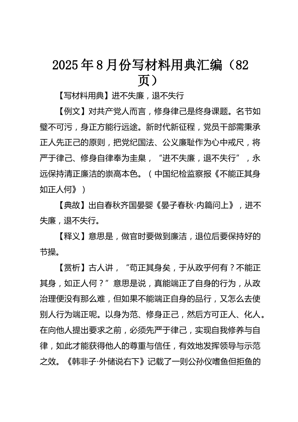 2025年8月份寫材料用典匯編(82頁)【寫材料用典】進(jìn)不失廉,退不失行【例文】對(duì)共產(chǎn)黨人而言,修身律己是終身課題。名節(jié)如璧不可污,身正方能行遠(yuǎn)途。新時(shí)代新征程,黨員干部需秉承正人先正己的原則,把黨紀(jì)國(guó)法、公義廉恥作為心中戒尺,將嚴(yán)于律己、修身自律奉為圭臬,“進(jìn)不失廉,退不失行”,永遠(yuǎn)保持清正廉潔的崇高本色。(中國(guó)紀(jì)檢監(jiān)察報(bào)《不能正其身如正人何》)【典故】出自春秋齊國(guó)晏嬰《晏子春秋·內(nèi)篇問上》,進(jìn)不失廉,退不失行?!踞屃x】意思是,做官時(shí)要做到廉潔,退位后要保持好的節(jié)操?!举p析】古人講,“茍正其身矣,于從政乎何有?不能正其身,如正人...