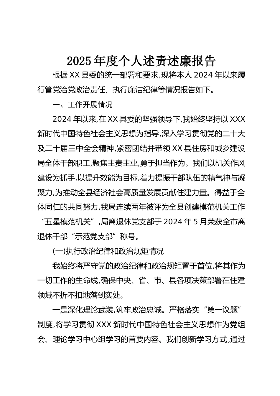 2025年度個人述責述廉報告根據(jù)XX縣委的統(tǒng)一部署和要求,現(xiàn)將本人2024年以來履行管黨治黨政治責任、執(zhí)行廉潔紀律等情況報告如下。一、工作開展情況2024年以來,在XX縣委的堅強領導下,我始終堅持以XXX新時代中國特色社會主義思想為指導,深入學習貫徹黨的二十大及二十屆三中全會精神,緊密團結并帶領XX縣住房和城鄉(xiāng)建設局全體干部職工,聚焦主責主業(yè),勇于擔當作為。我們以機關作風建設為抓手,以提升效能為目標,著力提振干部隊伍的精氣神與凝聚力,為推動全縣經(jīng)濟社會高質(zhì)量發(fā)展貢獻住建力量。得益于全體同仁的共同努力,我局連續(xù)兩年被評為全縣創(chuàng)建模范機關工作“五星模范機關”,...