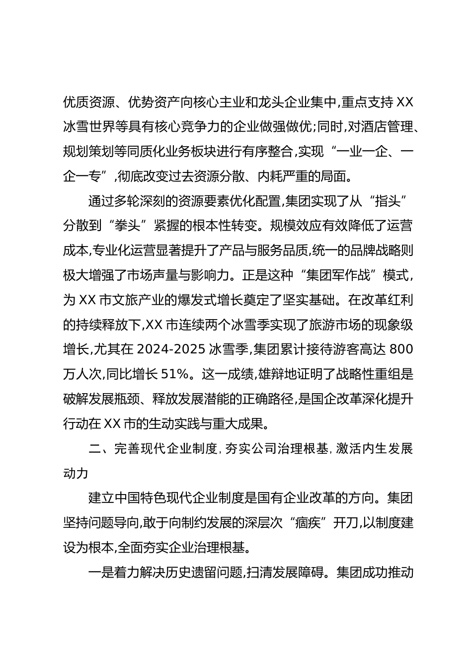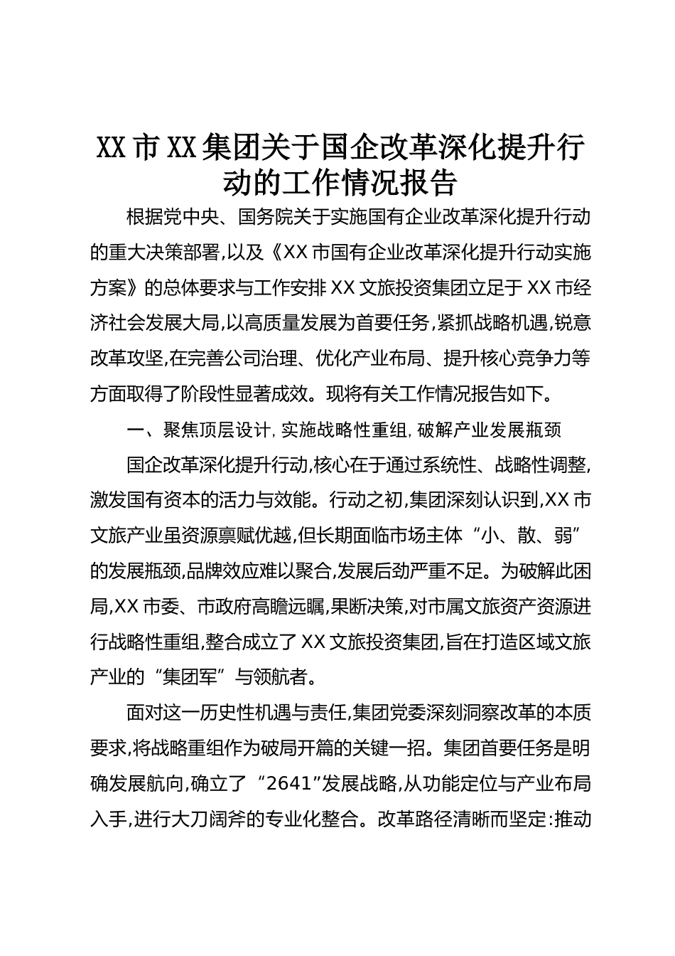 XX市XX集團關(guān)于國企改革深化提升行動的工作情況報告根據(jù)黨中央、國務(wù)院關(guān)于實施國有企業(yè)改革深化提升行動的重大決策部署,以及《XX市國有企業(yè)改革深化提升行動實施方案》的總體要求與工作安排XX文旅投資集團立足于XX市經(jīng)濟社會發(fā)展大局,以高質(zhì)量發(fā)展為首要任務(wù),緊抓戰(zhàn)略機遇,銳意改革攻堅,在完善公司治理、優(yōu)化產(chǎn)業(yè)布局、提升核心競爭力等方面取得了階段性顯著成效。現(xiàn)將有關(guān)工作情況報告如下。一、聚焦頂層設(shè)計,實施戰(zhàn)略性重組,破解產(chǎn)業(yè)發(fā)展瓶頸國企改革深化提升行動,核心在于通過系統(tǒng)性、戰(zhàn)略性調(diào)整,激發(fā)國有資本的活力與效能。行動之初,集團深刻認識到,XX市文旅產(chǎn)業(yè)雖...