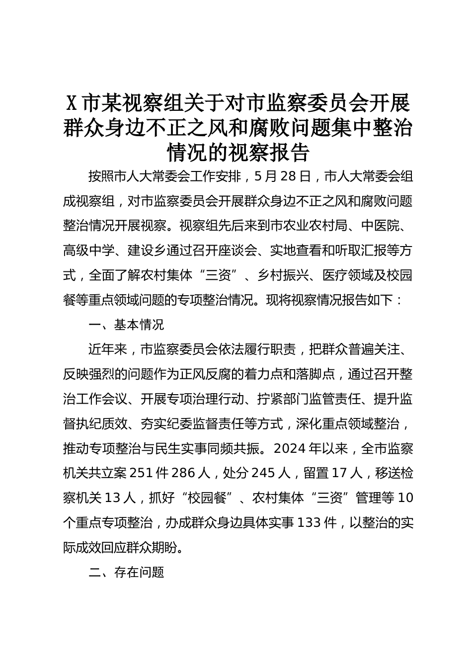 X市某視察組關(guān)于對市監(jiān)察委員會開展群眾身邊不正之風(fēng)和腐敗問題集中整治情況的視察報告