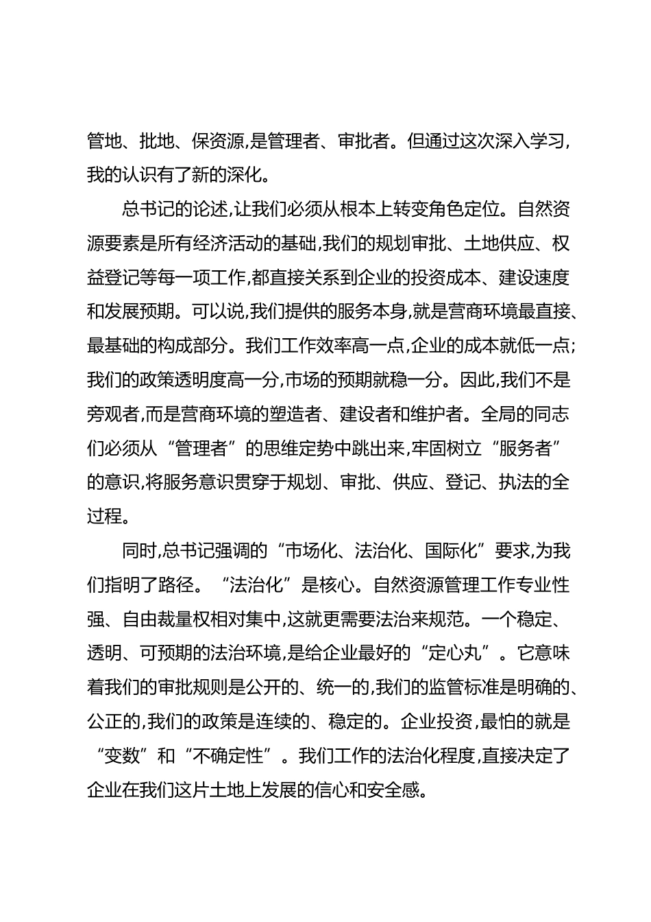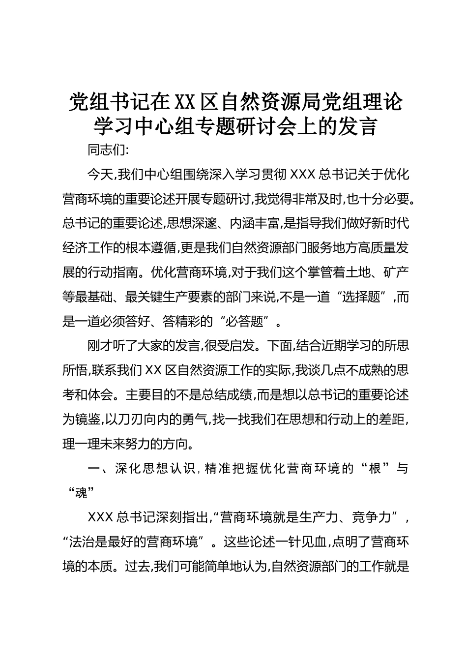黨組書記在XX區(qū)自然資源局黨組理論學(xué)習(xí)中心組專題研討會(huì)上的發(fā)言同志們:今天,我們中心組圍繞深入學(xué)習(xí)貫徹XXX總書記關(guān)于優(yōu)化營商環(huán)境的重要論述開展專題研討,我覺得非常及時(shí),也十分必要??倳浀闹匾撌?思想深邃、內(nèi)涵豐富,是指導(dǎo)我們做好新時(shí)代經(jīng)濟(jì)工作的根本遵循,更是我們自然資源部門服務(wù)地方高質(zhì)量發(fā)展的行動(dòng)指南。優(yōu)化營商環(huán)境,對(duì)于我們這個(gè)掌管著土地、礦產(chǎn)等最基礎(chǔ)、最關(guān)鍵生產(chǎn)要素的部門來說,不是一道“選擇題”,而是一道必須答好、答精彩的“必答題”。剛才聽了大家的發(fā)言,很受啟發(fā)。下面,結(jié)合近期學(xué)習(xí)的所思所悟,聯(lián)系我們XX區(qū)自然資源工作的實(shí)際,我談幾點(diǎn)不...