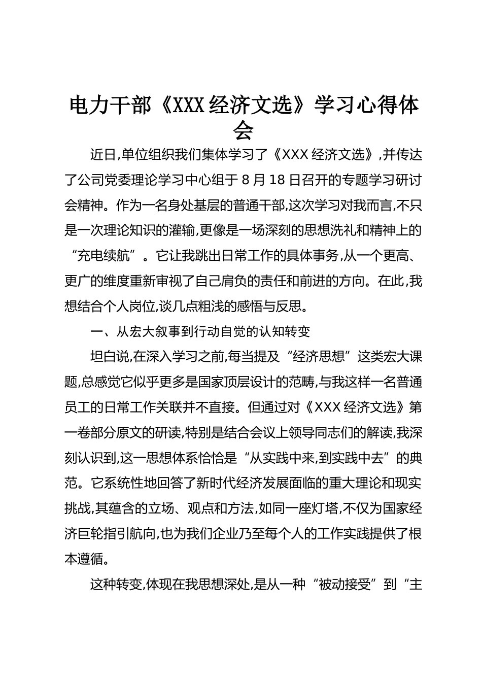 電力干部《XXX經(jīng)濟文選》學(xué)習(xí)心得體會近日,單位組織我們集體學(xué)習(xí)了《XXX經(jīng)濟文選》,并傳達了公司黨委理論學(xué)習(xí)中心組于8月18日召開的專題學(xué)習(xí)研討會精神。作為一名身處基層的普通干部,這次學(xué)習(xí)對我而言,不只是一次理論知識的灌輸,更像是一場深刻的思想洗禮和精神上的“充電續(xù)航”。它讓我跳出日常工作的具體事務(wù),從一個更高、更廣的維度重新審視了自己肩負的責(zé)任和前進的方向。在此,我想結(jié)合個人崗位,談幾點粗淺的感悟與反思。一、從宏大敘事到行動自覺的認知轉(zhuǎn)變坦白說,在深入學(xué)習(xí)之前,每當(dāng)提及“經(jīng)濟思想”這類宏大課題,總感覺它似乎更多是國家頂層設(shè)計的范疇,與我這樣...