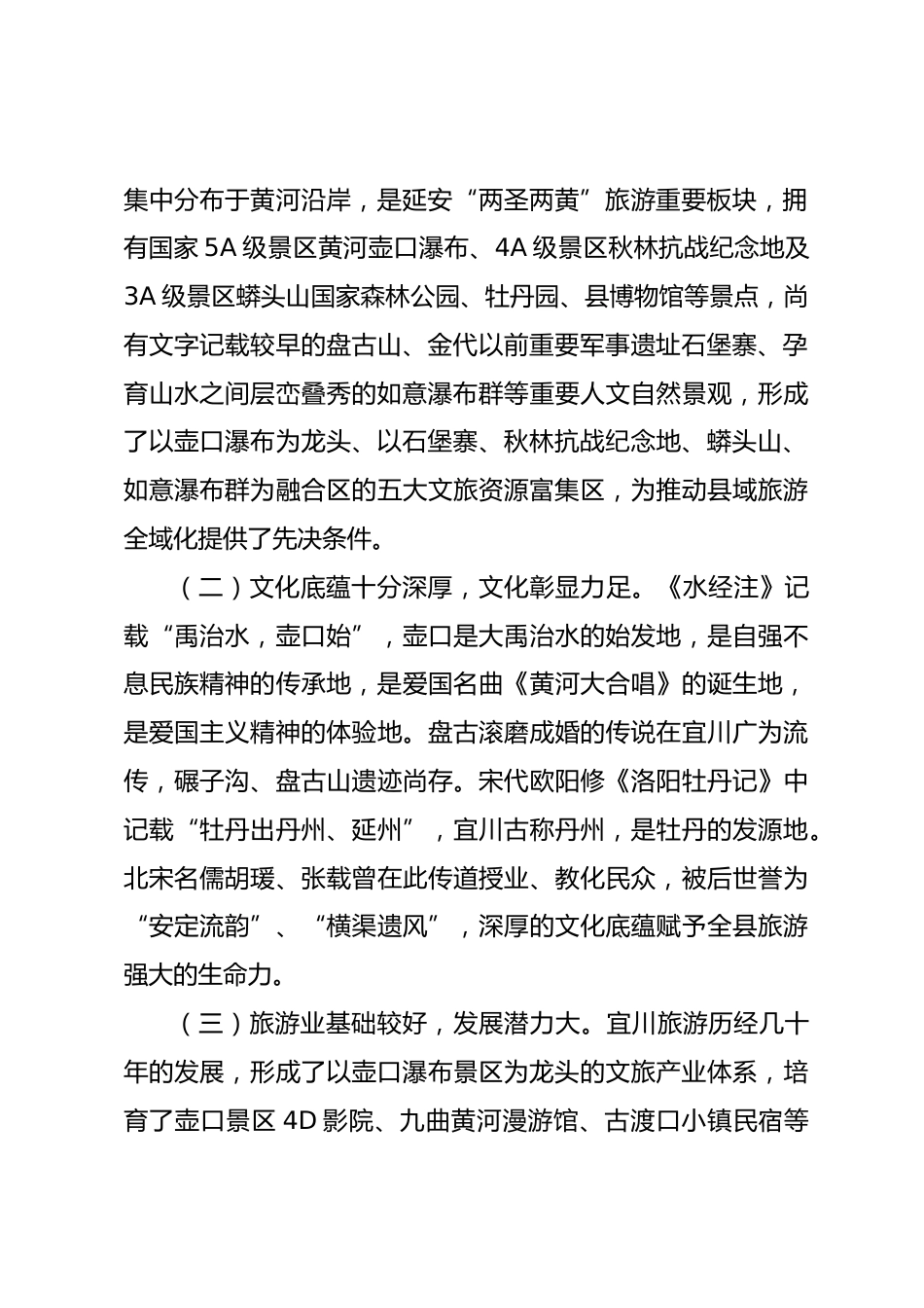 調(diào)研報告:關(guān)關(guān)于宜川縣文化旅游業(yè)發(fā)展的調(diào)研與思考宜川地處陜西省北部、延安市東南部、黃河中游壺口瀑布之濱,國土總面積2931平方公里,轄4鎮(zhèn)2鄉(xiāng)1個街道辦事處,總?cè)丝?1.2萬人。近年來,全縣上下深入學(xué)習(xí)貫徹XXX新時代中國特色社會主義思想、XXX總書記歷次來陜考察重要講話重要指示,積極融入新時代延安加快中國式現(xiàn)代化建設(shè)“一六四”工作布局,堅持以黃河流域生態(tài)保護(hù)和高質(zhì)量發(fā)展為統(tǒng)領(lǐng),奮力走“生態(tài)優(yōu)先、文旅融合、立工強(qiáng)農(nóng)、全民營商、優(yōu)教聚才、城鄉(xiāng)共興”的高質(zhì)量發(fā)展之路,尤其是堅持把文化旅游業(yè)作為縣域首位產(chǎn)業(yè),加快推進(jìn)景點觀光旅游向休閑度假旅游轉(zhuǎn)型...