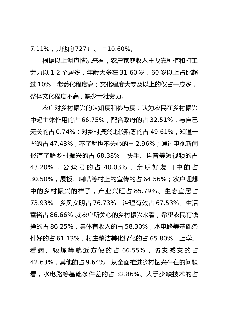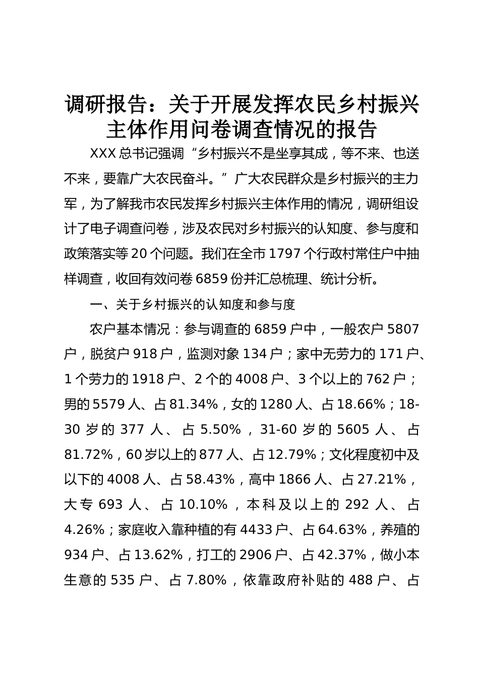 調(diào)研報(bào)告:關(guān)于開展發(fā)揮農(nóng)民鄉(xiāng)村振興主體作用問(wèn)卷調(diào)查情況的報(bào)告XXX總書記強(qiáng)調(diào)“鄉(xiāng)村振興不是坐享其成,等不來(lái)、也送不來(lái),要靠廣大農(nóng)民奮斗?!睆V大農(nóng)民群眾是鄉(xiāng)村振興的主力軍,為了解我市農(nóng)民發(fā)揮鄉(xiāng)村振興主體作用的情況,調(diào)研組設(shè)計(jì)了電子調(diào)查問(wèn)卷,涉及農(nóng)民對(duì)鄉(xiāng)村振興的認(rèn)知度、參與度和政策落實(shí)等20個(gè)問(wèn)題。我們?cè)谌?797個(gè)行政村常住戶中抽樣調(diào)查,收回有效問(wèn)卷6859份并匯總梳理、統(tǒng)計(jì)分析。一、關(guān)于鄉(xiāng)村振興的認(rèn)知度和參與度農(nóng)戶基本情況:參與調(diào)查的6859戶中,一般農(nóng)戶5807戶,脫貧戶918戶,監(jiān)測(cè)對(duì)象134戶;家中無(wú)勞力的171戶、1個(gè)勞力的1918戶、2個(gè)的4008戶、...