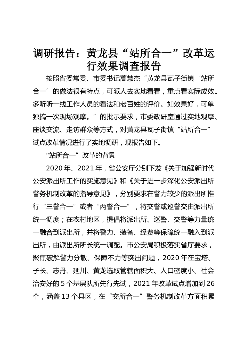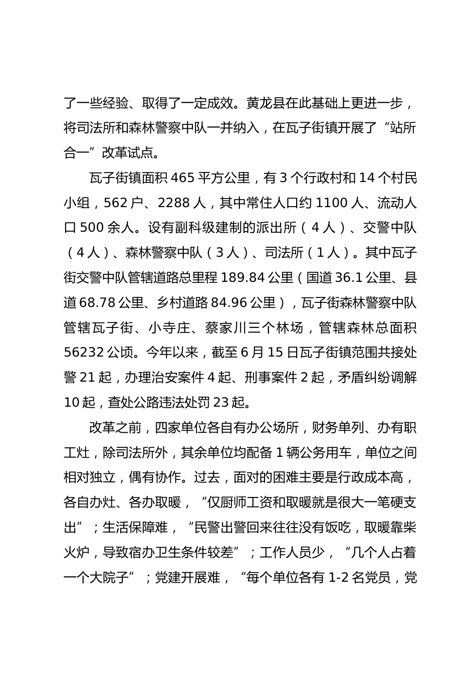 調(diào)研報告:黃龍縣“站所合一”改革運行效果調(diào)查報告按照省委常委、市委書記蒿慧杰“黃龍縣瓦子街鎮(zhèn)‘站所合一’的做法很有特點,可派人去實地看看,重點看實際成效。多聽聽一線工作人員的看法和老百姓的評價。如效果好,可單獨搞一次現(xiàn)場觀摩?!钡呐疽螅形惺彝ㄟ^實地觀摩、座談交流、走訪群眾等方式,對黃龍縣瓦子街鎮(zhèn)“站所合一”試點改革情況進行了實地調(diào)研,現(xiàn)報告如下?!罢舅弦弧备母锏谋尘?020年、2021年,省公安廳分別下發(fā)《關(guān)于加強新時代公安派出所工作的實施意見》和《關(guān)于進一步深化公安派出所警務(wù)機制改革的指導(dǎo)意見》,分別要求在警力較少的派...