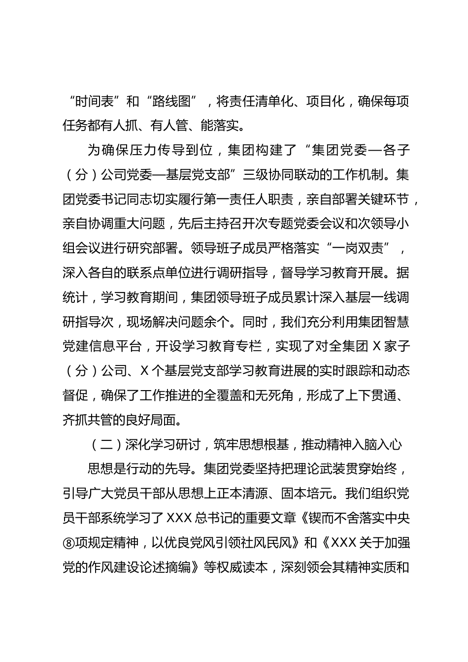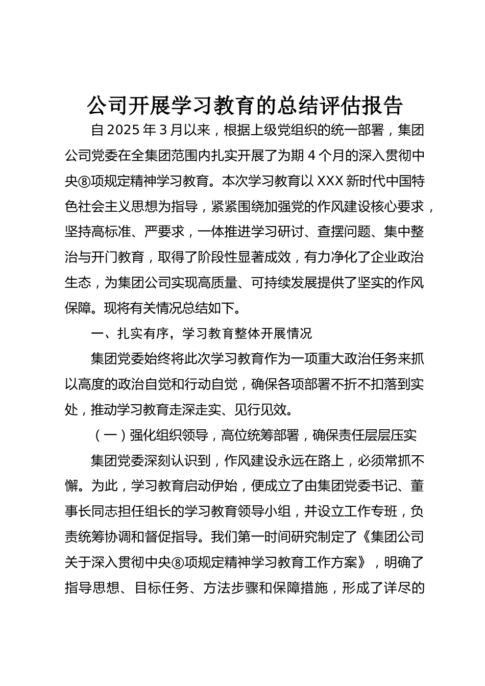 公司開展學(xué)習(xí)教育的總結(jié)評(píng)估報(bào)告自2025年3月以來,根據(jù)上級(jí)黨組織的統(tǒng)一部署,集團(tuán)公司黨委在全集團(tuán)范圍內(nèi)扎實(shí)開展了為期4個(gè)月的深入貫徹中央⑧項(xiàng)規(guī)定精神學(xué)習(xí)教育。本次學(xué)習(xí)教育以XXX新時(shí)代中國(guó)特色社會(huì)主義思想為指導(dǎo),緊緊圍繞加強(qiáng)黨的作風(fēng)建設(shè)核心要求,堅(jiān)持高標(biāo)準(zhǔn)、嚴(yán)要求,一體推進(jìn)學(xué)習(xí)研討、查擺問題、集中整治與開門教育,取得了階段性顯著成效,有力凈化了企業(yè)政治生態(tài),為集團(tuán)公司實(shí)現(xiàn)高質(zhì)量、可持續(xù)發(fā)展提供了堅(jiān)實(shí)的作風(fēng)保障?,F(xiàn)將有關(guān)情況總結(jié)如下。一、扎實(shí)有序,學(xué)習(xí)教育整體開展情況集團(tuán)黨委始終將此次學(xué)習(xí)教育作為一項(xiàng)重大政治任務(wù)來抓以高度的政治自覺...