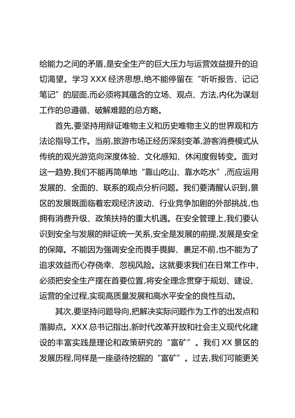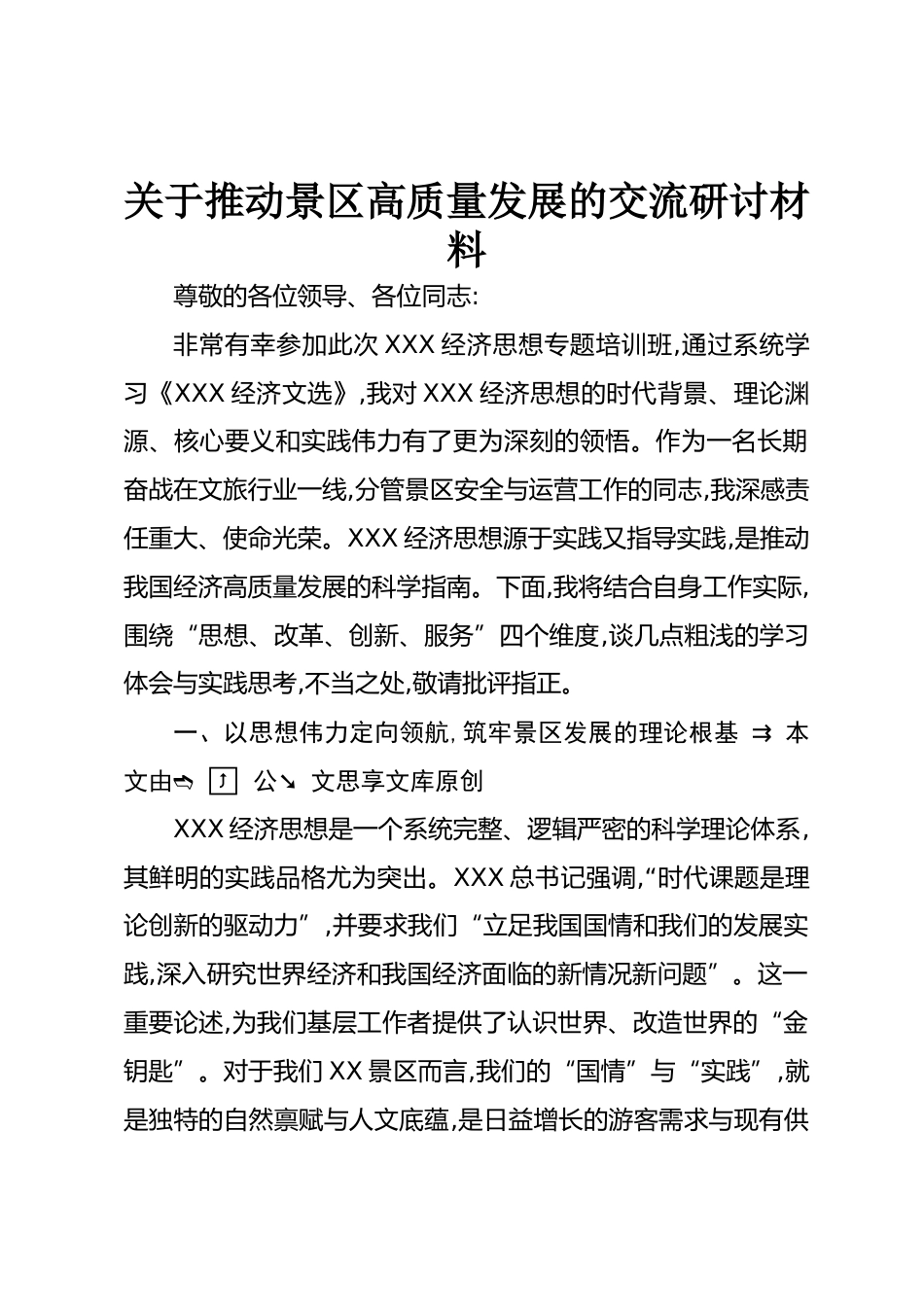 關(guān)于推動景區(qū)高質(zhì)量發(fā)展的交流研討材料尊敬的各位領(lǐng)導(dǎo)、各位同志:非常有幸參加此次XXX經(jīng)濟思想專題培訓(xùn)班,通過系統(tǒng)學(xué)習(xí)《XXX經(jīng)濟文選》,我對XXX經(jīng)濟思想的時代背景、理論淵源、核心要義和實踐偉力有了更為深刻的領(lǐng)悟。作為一名長期奮戰(zhàn)在文旅行業(yè)一線,分管景區(qū)安全與運營工作的同志,我深感責(zé)任重大、使命光榮。XXX經(jīng)濟思想源于實踐又指導(dǎo)實踐,是推動我國經(jīng)濟高質(zhì)量發(fā)展的科學(xué)指南。下面,我將結(jié)合自身工作實際,圍繞“思想、改革、創(chuàng)新、服務(wù)”四個維度,談幾點粗淺的學(xué)習(xí)體會與實踐思考,不當(dāng)之處,敬請批評指正。一、以思想偉力定向領(lǐng)航,筑牢景區(qū)發(fā)展的理論根基?本文由??...