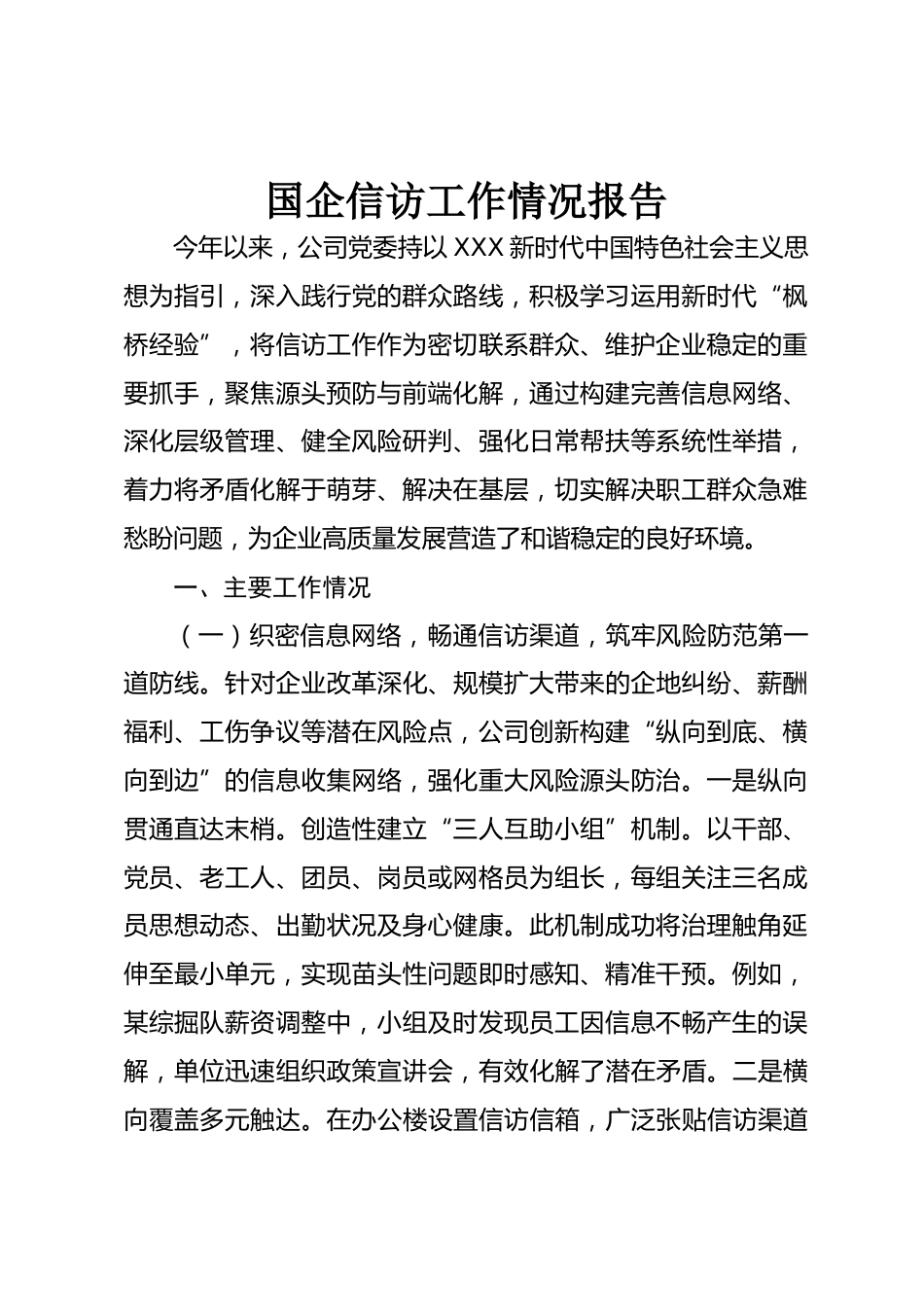 國(guó)企信訪工作情況報(bào)告今年以來(lái),公司黨委持以XXX新時(shí)代中國(guó)特色社會(huì)主義思想為指引,深入踐行黨的群眾路線,積極學(xué)習(xí)運(yùn)用新時(shí)代“楓橋經(jīng)驗(yàn)”,將信訪工作作為密切聯(lián)系群眾、維護(hù)企業(yè)穩(wěn)定的重要抓手,聚焦源頭預(yù)防與前端化解,通過(guò)構(gòu)建完善信息網(wǎng)絡(luò)、深化層級(jí)管理、健全風(fēng)險(xiǎn)研判、強(qiáng)化日常幫扶等系統(tǒng)性舉措,著力將矛盾化解于萌芽、解決在基層,切實(shí)解決職工群眾急難愁盼問(wèn)題,為企業(yè)高質(zhì)量發(fā)展?fàn)I造了和諧穩(wěn)定的良好環(huán)境。一、主要工作情況(一)織密信息網(wǎng)絡(luò),暢通信訪渠道,筑牢風(fēng)險(xiǎn)防范第一道防線。針對(duì)企業(yè)改革深化、規(guī)模擴(kuò)大帶來(lái)的企地糾紛、薪酬福利、工傷爭(zhēng)議等潛...