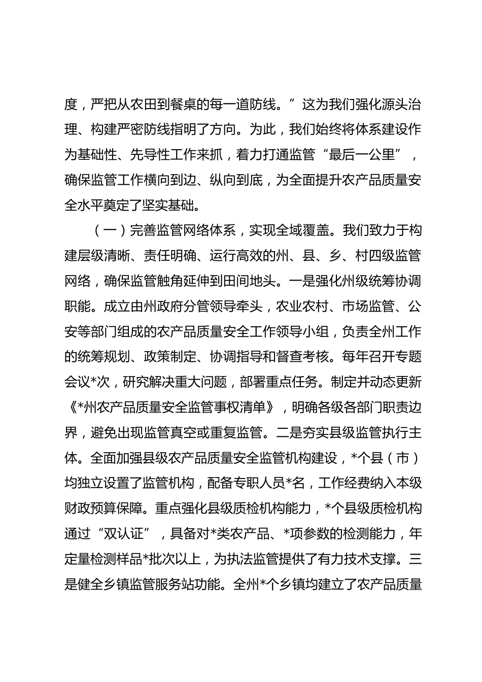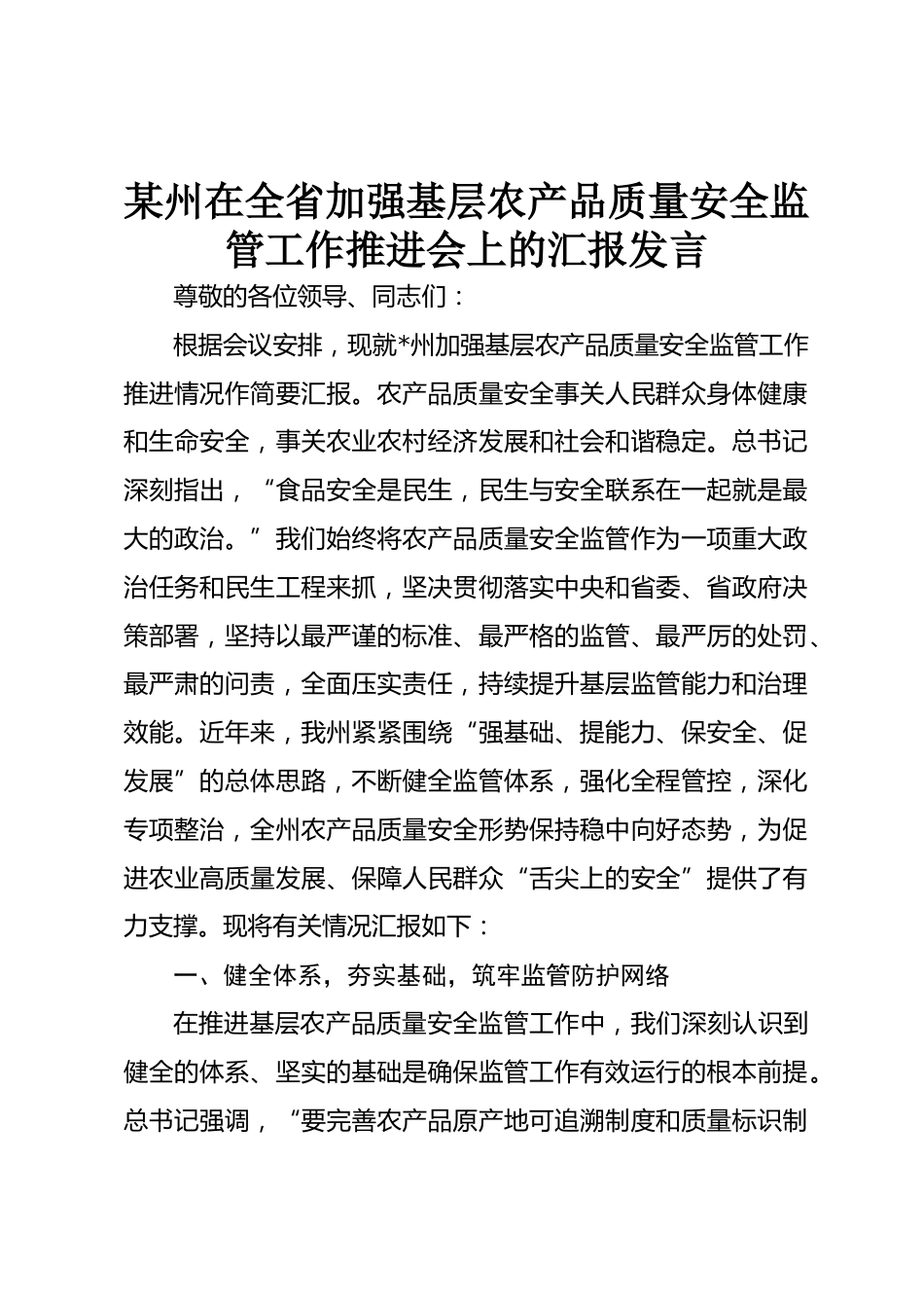 某州在全省加強(qiáng)基層農(nóng)產(chǎn)品質(zhì)量安全監(jiān)管工作推進(jìn)會上的匯報發(fā)言