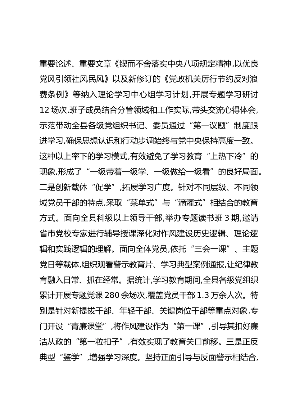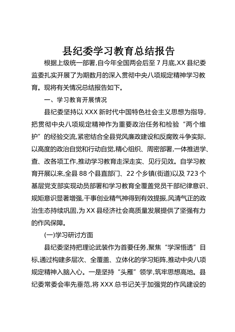 縣紀(jì)委學(xué)習(xí)教育總結(jié)報(bào)告根據(jù)上級(jí)統(tǒng)一部署,自今年全國(guó)兩會(huì)后至7月底,XX縣紀(jì)委監(jiān)委扎實(shí)開(kāi)展了為期數(shù)月的深入貫徹中央八項(xiàng)規(guī)定精神學(xué)習(xí)教育?,F(xiàn)將有關(guān)情況總結(jié)報(bào)告如下。一、學(xué)習(xí)教育開(kāi)展情況縣紀(jì)委堅(jiān)持以XXX新時(shí)代中國(guó)特色社會(huì)主義思想為指導(dǎo),把貫徹中央八項(xiàng)規(guī)定精神作為重要政治任務(wù)和檢驗(yàn)“兩個(gè)維護(hù)”的經(jīng)驗(yàn)交流,緊密結(jié)合全縣黨風(fēng)廉政建設(shè)和反腐敗斗爭(zhēng)實(shí)際,以高度的政治自覺(jué)和行動(dòng)自覺(jué),精心組織、周密部署,一體推進(jìn)學(xué)、查、改各項(xiàng)工作,推動(dòng)學(xué)習(xí)教育走深走實(shí)、見(jiàn)行見(jiàn)效。自學(xué)習(xí)教育開(kāi)展以來(lái),全縣88個(gè)縣直部門(mén)、22個(gè)鄉(xiāng)鎮(zhèn)(街道)以及723個(gè)基層黨支部實(shí)現(xiàn)動(dòng)員部署和學(xué)習(xí)教育全...