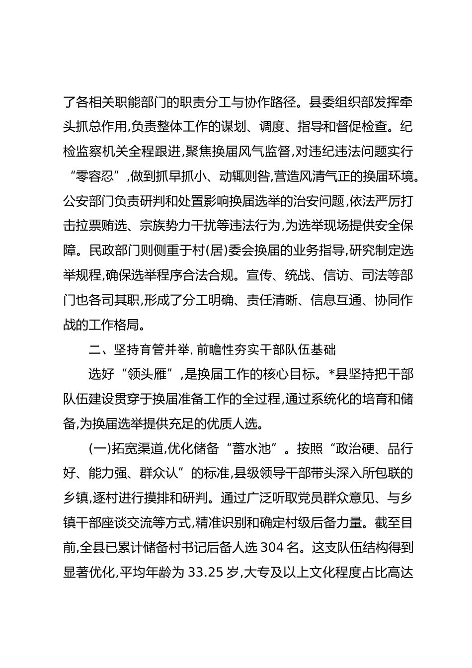 縣委組織部關(guān)于村(社區(qū))“兩委”換屆準(zhǔn)備工作情況的報(bào)告為確保即將到來的村(社區(qū))“兩委”換屆選舉工作平穩(wěn)、健康、有序進(jìn)行,選優(yōu)配強(qiáng)新一屆村(社區(qū))領(lǐng)導(dǎo)班子,根據(jù)上級(jí)黨委的統(tǒng)一部署和要求,*縣委高度重視,及早謀劃,精心組織,扎實(shí)推進(jìn)各項(xiàng)準(zhǔn)備工作。現(xiàn)將有關(guān)情況報(bào)告如下。一、堅(jiān)持高位統(tǒng)籌,系統(tǒng)構(gòu)建換屆工作組織保障體系換屆工作是基層政治生活中的一件大事,事關(guān)全局、影響深遠(yuǎn)。*縣委深刻認(rèn)識(shí)到此項(xiàng)工作的重要性與復(fù)雜性,始終將其作為當(dāng)前一項(xiàng)重大政治任務(wù)來抓,堅(jiān)持黨的全面領(lǐng)導(dǎo),確保換屆工作正確的政治方向。(一)強(qiáng)化組織領(lǐng)導(dǎo)與頂層設(shè)計(jì)??h委第一時(shí)間成立了由主要...