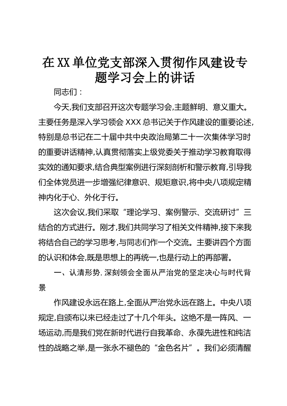 在XX單位黨支部深入貫徹作風(fēng)建設(shè)專題學(xué)習(xí)會上的講話