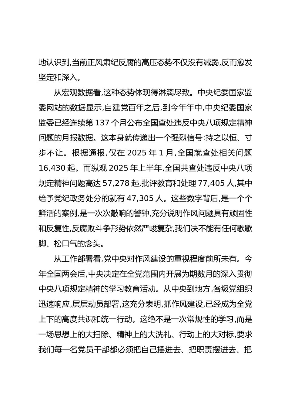 在XX單位黨支部深入貫徹作風(fēng)建設(shè)專題學(xué)習(xí)會上的講話同志們:今天,我們支部召開這次專題學(xué)習(xí)會,主題鮮明、意義重大。主要任務(wù)是深入學(xué)習(xí)領(lǐng)會XXX總書記關(guān)于作風(fēng)建設(shè)的重要論述,特別是總書記在二十屆中共中央政治局第二十一次集體學(xué)習(xí)時的重要講話精神,認(rèn)真貫徹落實上級黨委關(guān)于推動學(xué)習(xí)教育取得實效的通知要求,結(jié)合典型案例進行深刻剖析和警示教育,引導(dǎo)我們?nèi)w黨員進一步增強紀(jì)律意識、規(guī)矩意識,將中央八項規(guī)定精神內(nèi)化于心、外化于行。這次會議,我們采取“理論學(xué)習(xí)、案例警示、交流研討”三結(jié)合的方式進行。剛才,我們共同學(xué)習(xí)了相關(guān)文件精神,接下來我將結(jié)合自己的學(xué)習(xí)思...