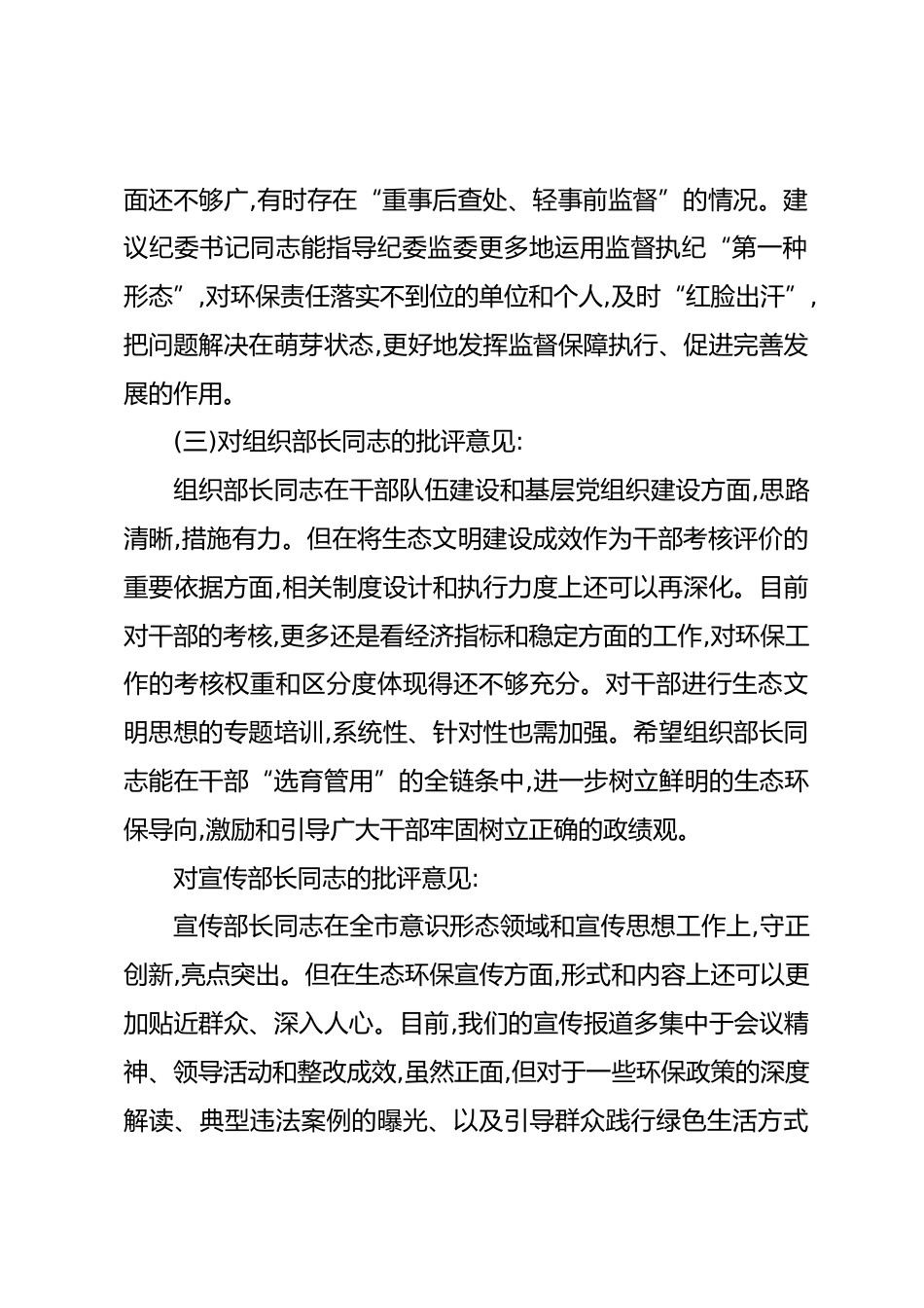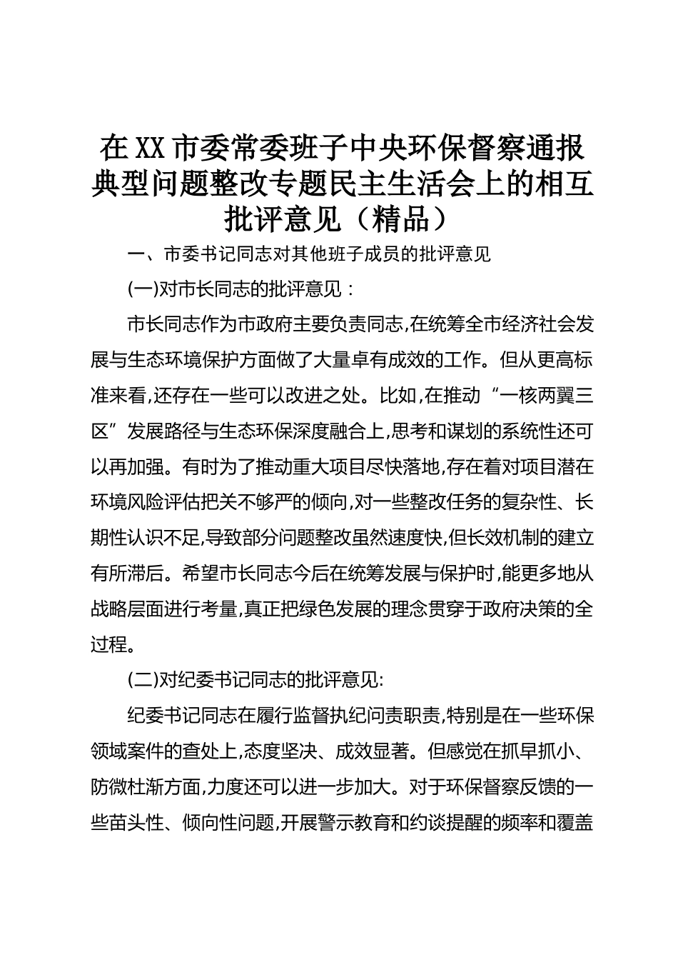 在XX市委常委班子中央環(huán)保督察通報典型問題整改專題民主生活會上的相互批評意見(精品)一、市委書記同志對其他班子成員的批評意見(一)對市長同志的批評意見:市長同志作為市政府主要負責同志,在統(tǒng)籌全市經(jīng)濟社會發(fā)展與生態(tài)環(huán)境保護方面做了大量卓有成效的工作。但從更高標準來看,還存在一些可以改進之處。比如,在推動“一核兩翼三區(qū)”發(fā)展路徑與生態(tài)環(huán)保深度融合上,思考和謀劃的系統(tǒng)性還可以再加強。有時為了推動重大項目盡快落地,存在著對項目潛在環(huán)境風險評估把關(guān)不夠嚴的傾向,對一些整改任務的復雜性、長期性認識不足,導致部分問題整改雖然速度快,但長效機制的建立有...