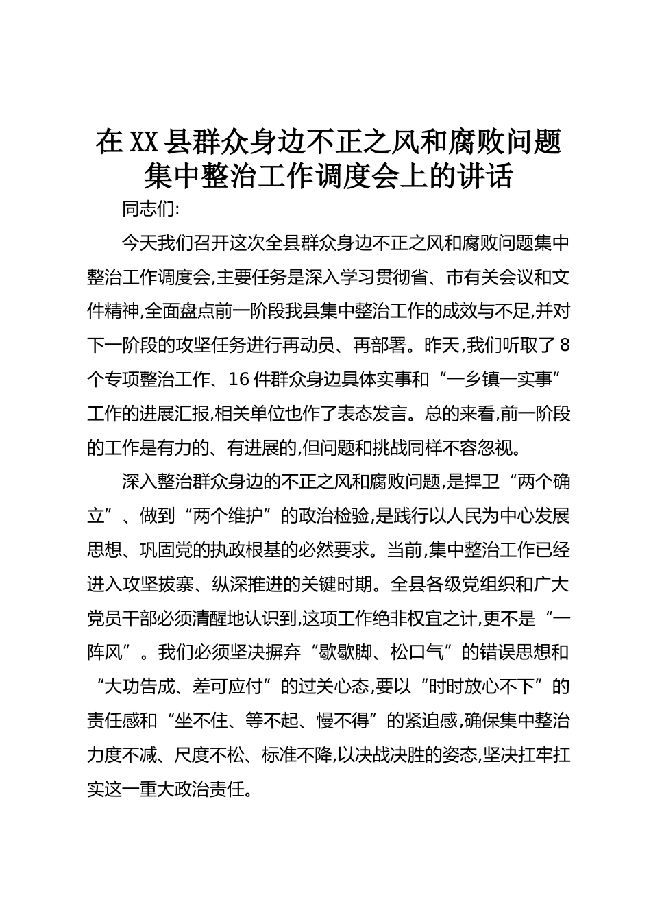 在XX縣群眾身邊不正之風和腐敗問題集中整治工作調(diào)度會上的講話