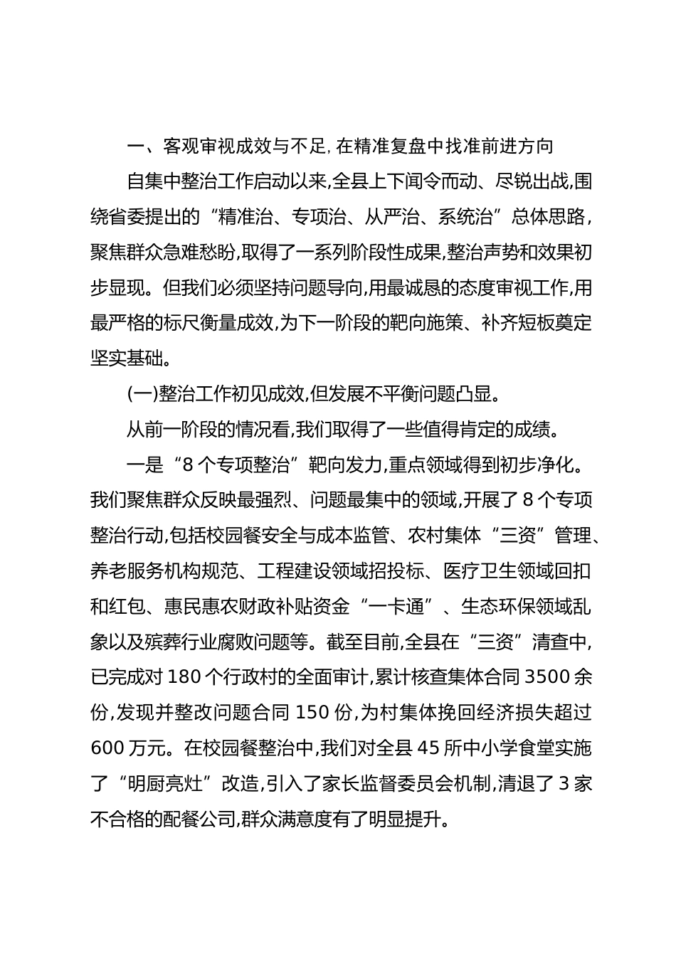在XX縣群眾身邊不正之風和腐敗問題集中整治工作調(diào)度會上的講話同志們:今天我們召開這次全縣群眾身邊不正之風和腐敗問題集中整治工作調(diào)度會,主要任務是深入學習貫徹省、市有關會議和文件精神,全面盤點前一階段我縣集中整治工作的成效與不足,并對下一階段的攻堅任務進行再動員、再部署。昨天,我們聽取了8個專項整治工作、16件群眾身邊具體實事和“一鄉(xiāng)鎮(zhèn)一實事”工作的進展匯報,相關單位也作了表態(tài)發(fā)言。總的來看,前一階段的工作是有力的、有進展的,但問題和挑戰(zhàn)同樣不容忽視。深入整治群眾身邊的不正之風和腐敗問題,是捍衛(wèi)“兩個確立”、做到“兩個維護”的政治檢驗,是踐...