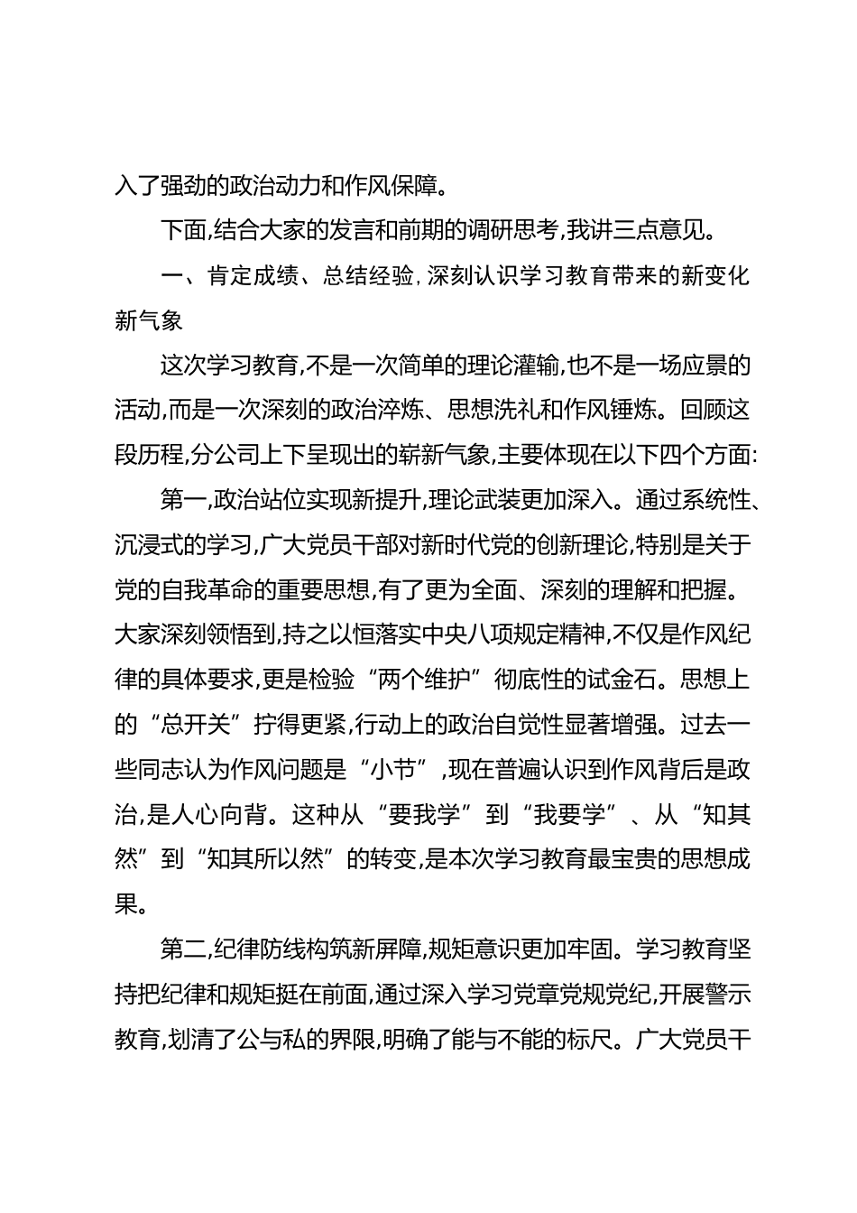在分公司專(zhuān)題評(píng)估座談會(huì)上的講話同志們:今天,在此召開(kāi)學(xué)習(xí)教育評(píng)估座談會(huì),主要目的是全面盤(pán)點(diǎn)前一階段學(xué)習(xí)教育的進(jìn)展與成效,深入聽(tīng)取來(lái)自基層一線同志們的真實(shí)感受與寶貴建議,并對(duì)下一步如何鞏固深化學(xué)習(xí)教育成果、推動(dòng)作風(fēng)建設(shè)常態(tài)化長(zhǎng)效化進(jìn)行再動(dòng)員、再部署。剛才,XX同志通報(bào)了分公司學(xué)習(xí)教育的整體開(kāi)展情況,27位來(lái)自不同單位、不同崗位的員工群眾代表作了非常坦誠(chéng)、非常深刻的交流發(fā)言,既有對(duì)學(xué)習(xí)教育成效的切身感受,也指出了工作中存在的現(xiàn)實(shí)問(wèn)題,更提出了許多富有建設(shè)性的意見(jiàn)建議。這些發(fā)言,充分體現(xiàn)了大家對(duì)分公司事業(yè)發(fā)展高度負(fù)責(zé)的主人翁精神,也展現(xiàn)了本次學(xué)習(xí)...