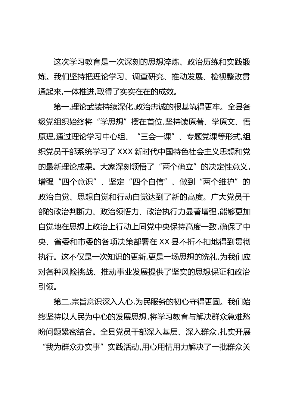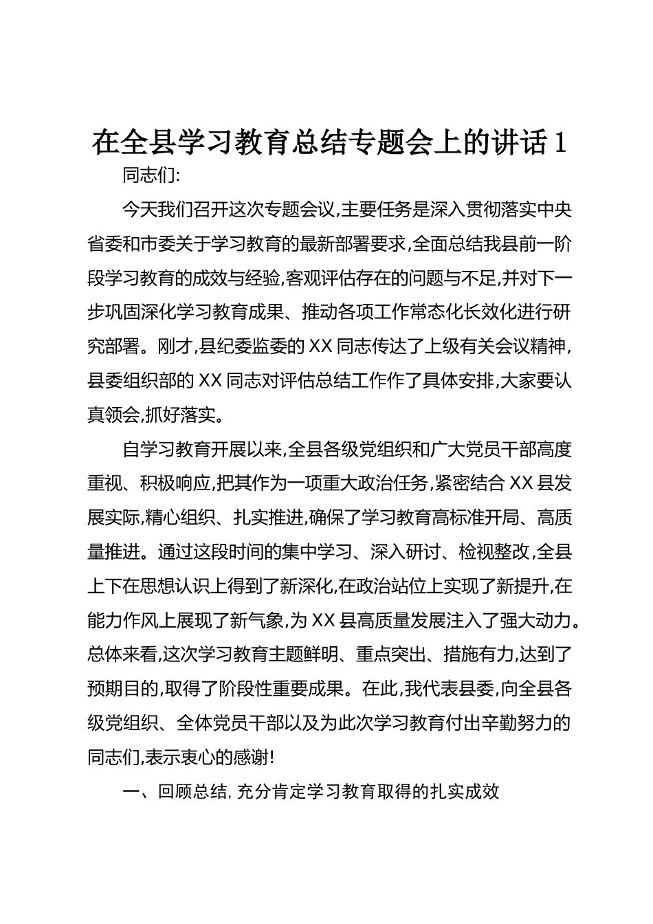 在全縣學(xué)習(xí)教育總結(jié)專題會(huì)上的講話1同志們:今天我們召開這次專題會(huì)議,主要任務(wù)是深入貫徹落實(shí)中央省委和市委關(guān)于學(xué)習(xí)教育的最新部署要求,全面總結(jié)我縣前一階段學(xué)習(xí)教育的成效與經(jīng)驗(yàn),客觀評(píng)估存在的問題與不足,并對(duì)下一步鞏固深化學(xué)習(xí)教育成果、推動(dòng)各項(xiàng)工作常態(tài)化長效化進(jìn)行研究部署。剛才,縣紀(jì)委監(jiān)委的XX同志傳達(dá)了上級(jí)有關(guān)會(huì)議精神,縣委組織部的XX同志對(duì)評(píng)估總結(jié)工作作了具體安排,大家要認(rèn)真領(lǐng)會(huì),抓好落實(shí)。自學(xué)習(xí)教育開展以來,全縣各級(jí)黨組織和廣大黨員干部高度重視、積極響應(yīng),把其作為一項(xiàng)重大政治任務(wù),緊密結(jié)合XX縣發(fā)展實(shí)際,精心組織、扎實(shí)推進(jìn),確保了學(xué)習(xí)教育高標(biāo)...
