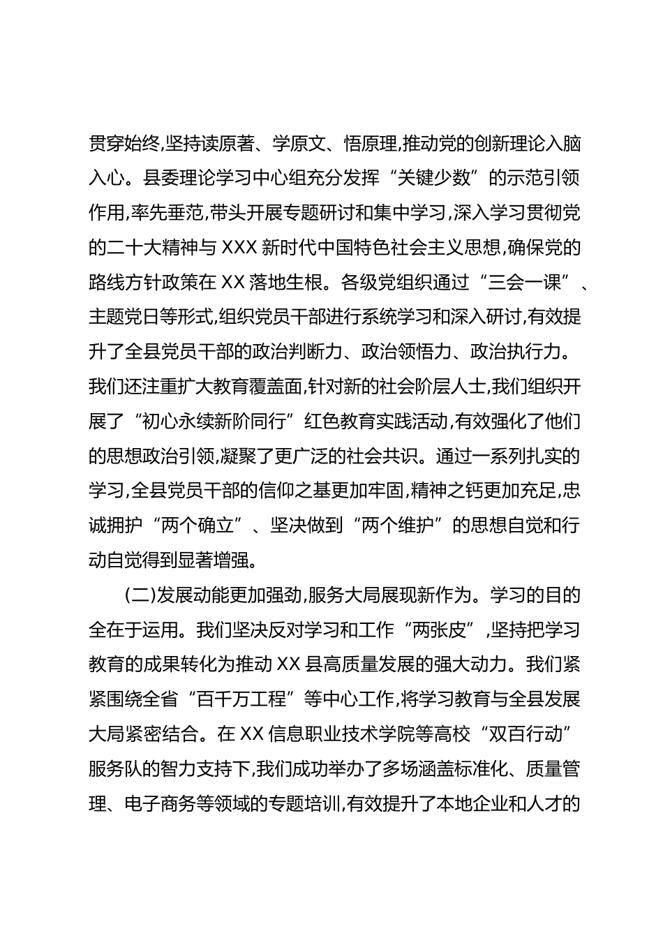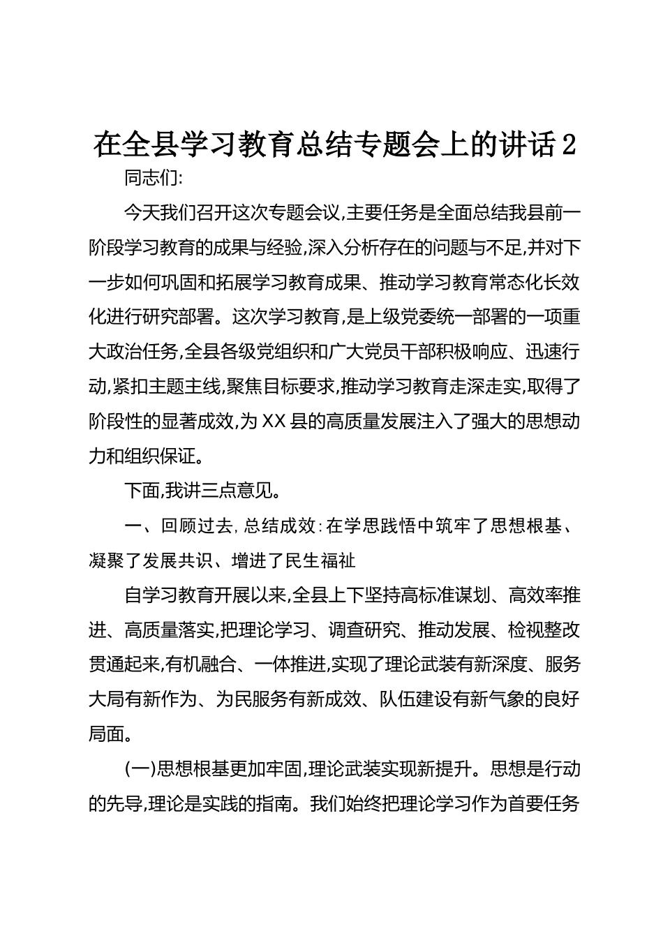 在全縣學(xué)習(xí)教育總結(jié)專題會(huì)上的講話2同志們:今天我們召開(kāi)這次專題會(huì)議,主要任務(wù)是全面總結(jié)我縣前一階段學(xué)習(xí)教育的成果與經(jīng)驗(yàn),深入分析存在的問(wèn)題與不足,并對(duì)下一步如何鞏固和拓展學(xué)習(xí)教育成果、推動(dòng)學(xué)習(xí)教育常態(tài)化長(zhǎng)效化進(jìn)行研究部署。這次學(xué)習(xí)教育,是上級(jí)黨委統(tǒng)一部署的一項(xiàng)重大政治任務(wù),全縣各級(jí)黨組織和廣大黨員干部積極響應(yīng)、迅速行動(dòng),緊扣主題主線,聚焦目標(biāo)要求,推動(dòng)學(xué)習(xí)教育走深走實(shí),取得了階段性的顯著成效,為XX縣的高質(zhì)量發(fā)展注入了強(qiáng)大的思想動(dòng)力和組織保證。下面,我講三點(diǎn)意見(jiàn)。一、回顧過(guò)去,總結(jié)成效:在學(xué)思踐悟中筑牢了思想根基、凝聚了發(fā)展共識(shí)、增進(jìn)了民生...