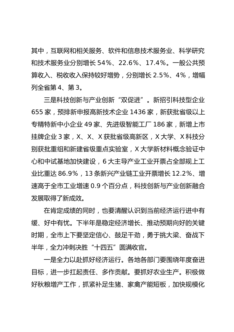 在市委常委會暨市委財經(jīng)委員會會議上的講話同志們:今年以來,我們頂住外部沖擊,積極應(yīng)對挑戰(zhàn),全市經(jīng)濟運行總體上穩(wěn)中有進(jìn)、穩(wěn)中向好。一是順利實現(xiàn)“雙過半”。上半年,實現(xiàn)地區(qū)生產(chǎn)總值3782.2億元,增長5.7%。全市27個主要經(jīng)濟指標(biāo)中,有18個指標(biāo)增幅高于省均,其中工業(yè)開票銷售、社會消費品零售總額、實際利用外資、進(jìn)出口總額、全體居民人均可支配收入等指標(biāo)增幅居全省前列。新招引億元以上重大項目數(shù)量達(dá)到年度目標(biāo)的76%,列省和市級重大項目開工率達(dá)94%以上、投資完成率均過半,“1號文件”確定的55項民生實事扎實推進(jìn),刑事案件立案數(shù)下降9.1%,經(jīng)濟社會發(fā)...