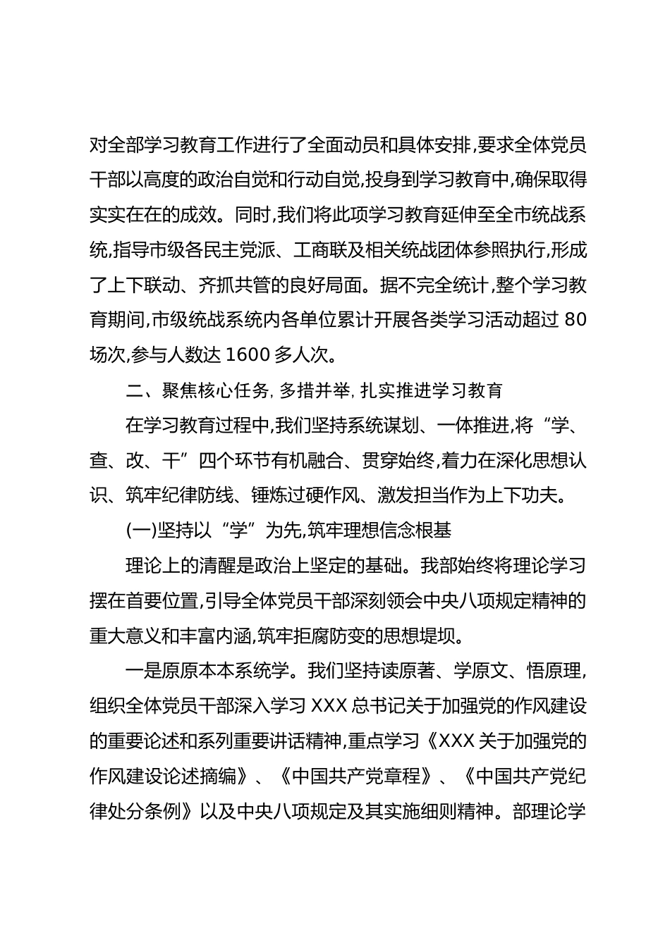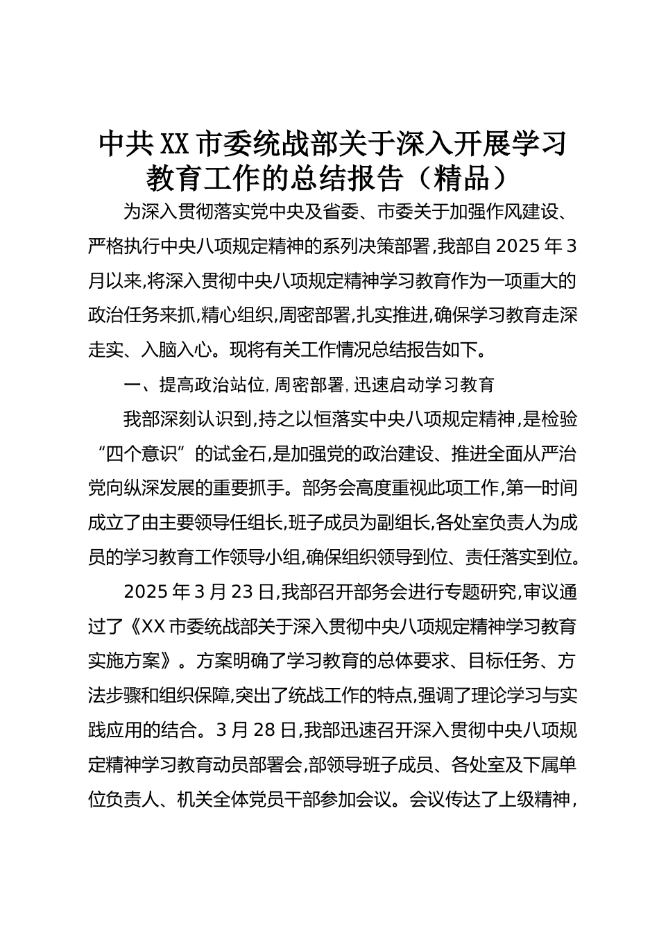 中共XX市委統(tǒng)戰(zhàn)部關(guān)于深入開展學(xué)習(xí)教育工作的總結(jié)報(bào)告(精品)為深入貫徹落實(shí)黨中央及省委、市委關(guān)于加強(qiáng)作風(fēng)建設(shè)、嚴(yán)格執(zhí)行中央八項(xiàng)規(guī)定精神的系列決策部署,我部自2025年3月以來,將深入貫徹中央八項(xiàng)規(guī)定精神學(xué)習(xí)教育作為一項(xiàng)重大的政治任務(wù)來抓,精心組織,周密部署,扎實(shí)推進(jìn),確保學(xué)習(xí)教育走深走實(shí)、入腦入心?,F(xiàn)將有關(guān)工作情況總結(jié)報(bào)告如下。一、提高政治站位,周密部署,迅速啟動學(xué)習(xí)教育我部深刻認(rèn)識到,持之以恒落實(shí)中央八項(xiàng)規(guī)定精神,是檢驗(yàn)“四個(gè)意識”的試金石,是加強(qiáng)黨的政治建設(shè)、推進(jìn)全面從嚴(yán)治黨向縱深發(fā)展的重要抓手。部務(wù)會高度重視此項(xiàng)工作,第一時(shí)間成立了由主...