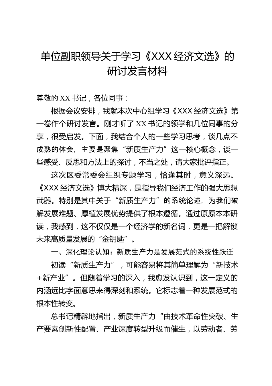 單位副職領(lǐng)導關(guān)于學習《習近平經(jīng)濟文選》的研討發(fā)言材料