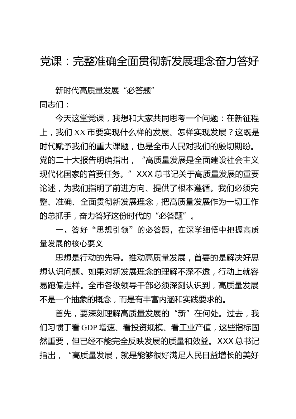 黨課:完整準確全面貫徹新發(fā)展理念奮力答好新時代高質(zhì)量發(fā)展“必答題”同志們:今天這堂黨課,我想和大家共同思考一個問題:在新征程上,我們XX市要實現(xiàn)什么樣的發(fā)展、怎樣實現(xiàn)發(fā)展?這既是時代賦予我們的重大課題,也是全市人民對我們的殷切期盼。黨的二十大報告明確指出,“高質(zhì)量發(fā)展是全面建設(shè)社會主義現(xiàn)代化國家的首要任務(wù)?!盭XX總書記關(guān)于高質(zhì)量發(fā)展的重要論述,為我們指明了前進方向、提供了根本遵循。我們必須完整、準確、全面貫徹新發(fā)展理念,把高質(zhì)量發(fā)展作為一切工作的總抓手,奮力答好這份時代的“必答題”。一、答好“思想引領(lǐng)”的必答題,在深學細悟中把...