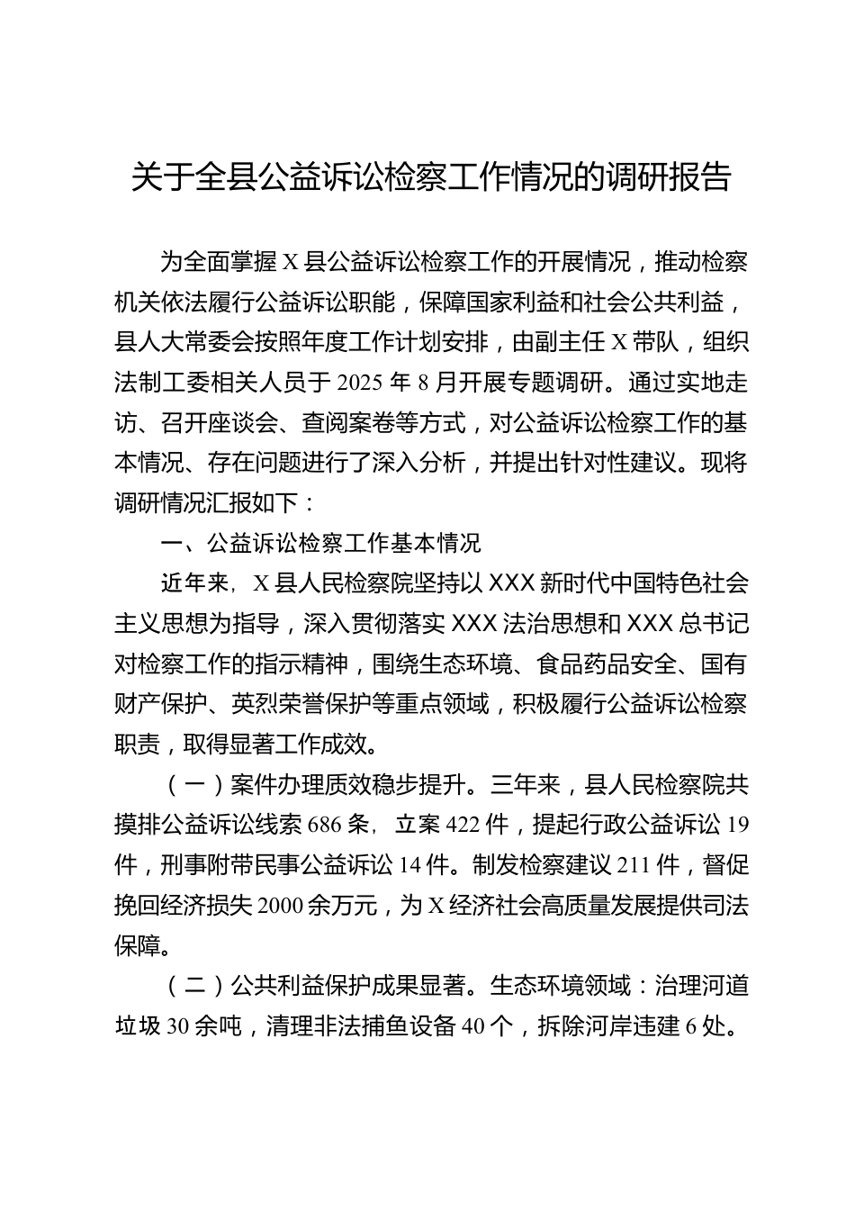 關于全縣公益訴訟檢察工作情況的調(diào)研報告為全面掌握X縣公益訴訟檢察工作的開展情況,推動檢察機關依法履行公益訴訟職能,保障國家利益和社會公共利益,縣人大常委會按照年度工作計劃安排,由副主任X帶隊,組織法制工委相關人員于2025年8月開展專題調(diào)研。通過實地走訪、召開座談會、查閱案卷等方式,對公益訴訟檢察工作的基本情況、存在問題進行了深入分析,并提出針對性建議?,F(xiàn)將調(diào)研情況匯報如下:一、公益訴訟檢察工作基本情況近年來,X縣人民檢察院堅持以XXX新時代中國特色社會主義思想為指導,深入貫徹落實XXX法治思想和XXX總書記對檢察工作的指示精神,圍繞生態(tài)環(huán)...