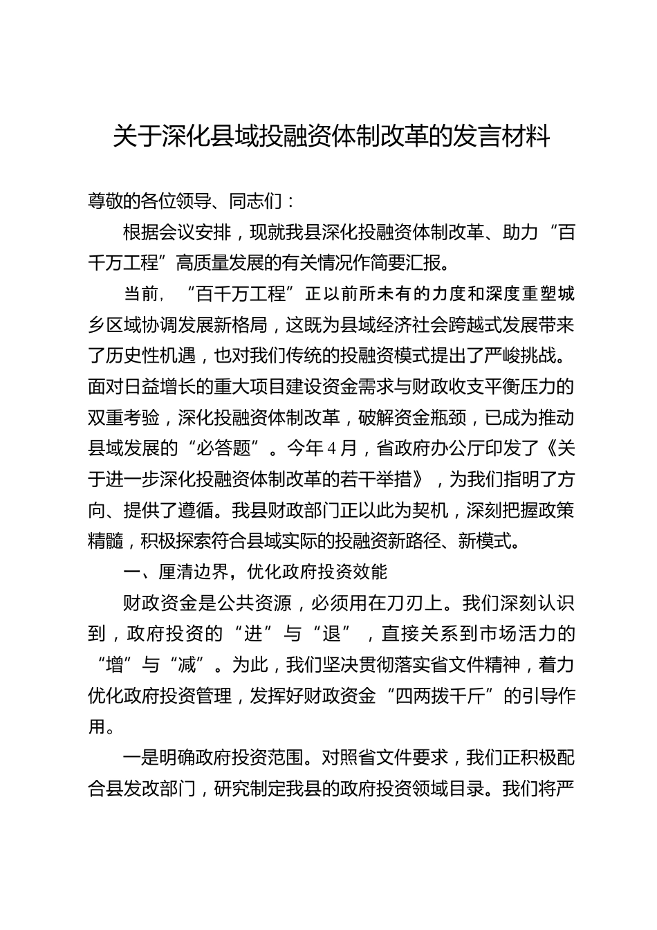 關(guān)于深化縣域投融資體制改革的發(fā)言材料尊敬的各位領(lǐng)導(dǎo)、同志們:根據(jù)會(huì)議安排,現(xiàn)就我縣深化投融資體制改革、助力“百千萬(wàn)工程”高質(zhì)量發(fā)展的有關(guān)情況作簡(jiǎn)要匯報(bào)。當(dāng)前,“百千萬(wàn)工程”正以前所未有的力度和深度重塑城鄉(xiāng)區(qū)域協(xié)調(diào)發(fā)展新格局,這既為縣域經(jīng)濟(jì)社會(huì)跨越式發(fā)展帶來(lái)了歷史性機(jī)遇,也對(duì)我們傳統(tǒng)的投融資模式提出了嚴(yán)峻挑戰(zhàn)。面對(duì)日益增長(zhǎng)的重大項(xiàng)目建設(shè)資金需求與財(cái)政收支平衡壓力的雙重考驗(yàn),深化投融資體制改革,破解資金瓶頸,已成為推動(dòng)縣域發(fā)展的“必答題”。今年4月,省政府辦公廳印發(fā)了《關(guān)于進(jìn)一步深化投融資體制改革的若干舉措》,為我們指明了方向、...